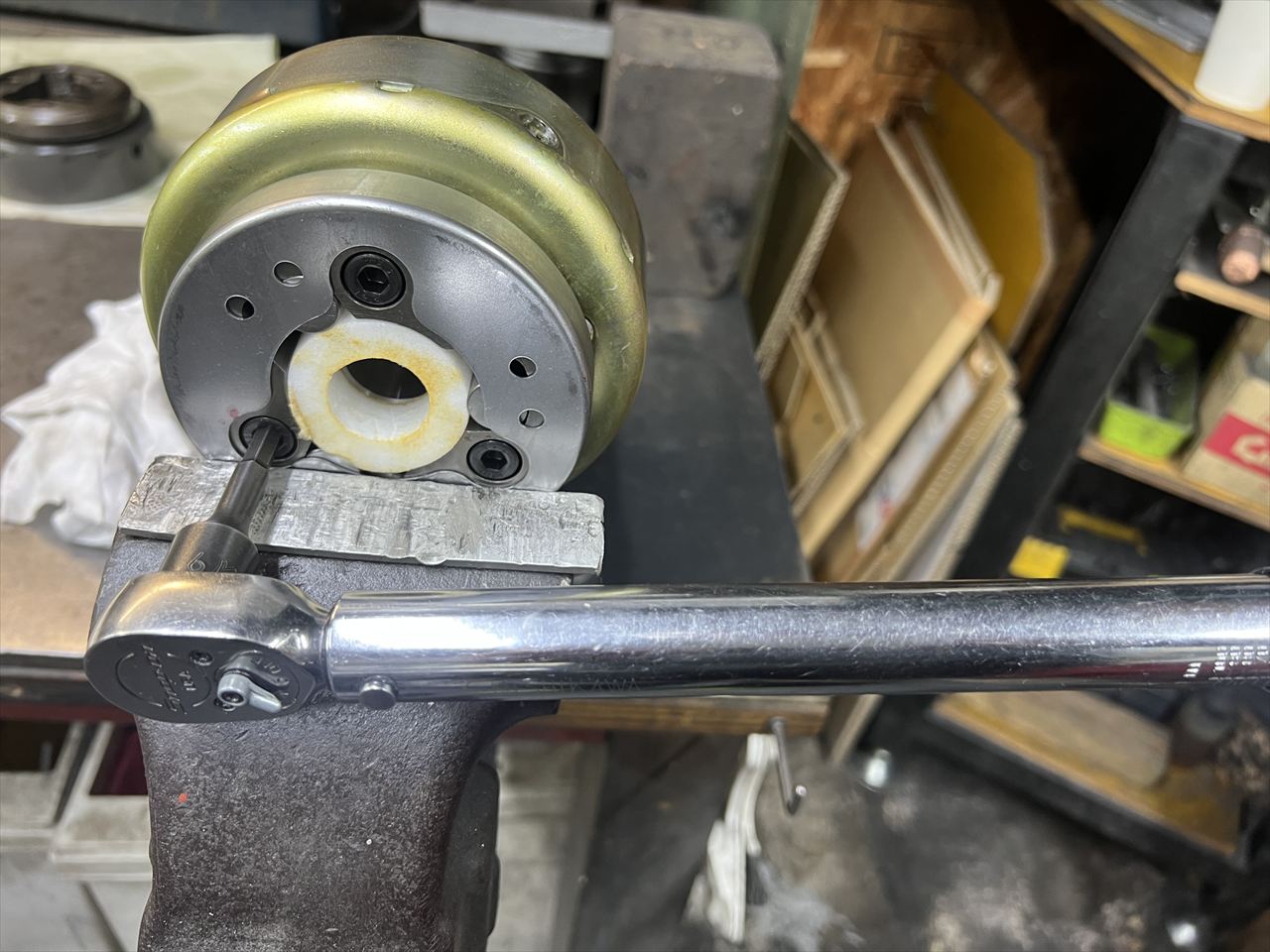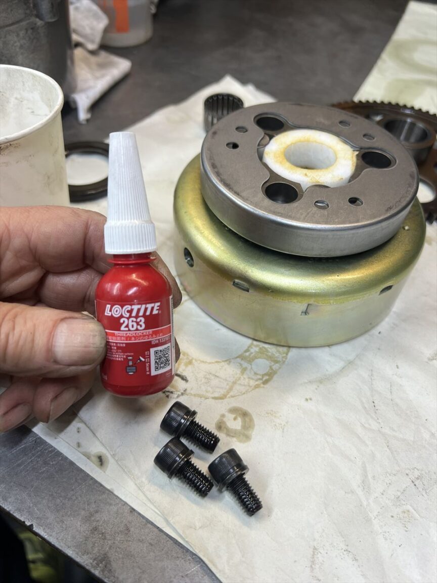 ローターにクラッチを取り付けます。ボルトにはロックタイトを塗布しておきます。
