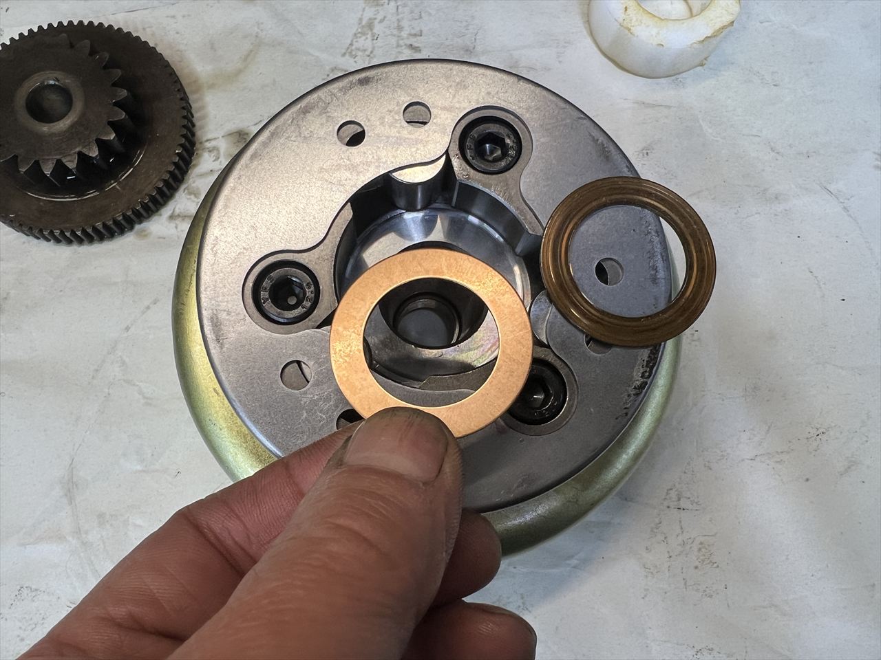 スターターギヤはこちら。これはもう生産終了なので、新品交換はできなくなりました。今のところ圧痕はそれほどひどくないので、今回はスタータークラッチ側のみ新品交換しておきます。