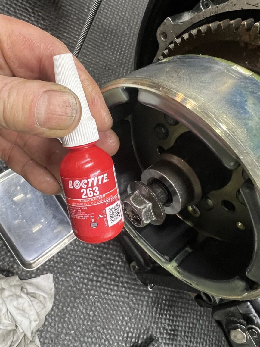 ローターの取り付けボルトにもロックタイトを塗布します。