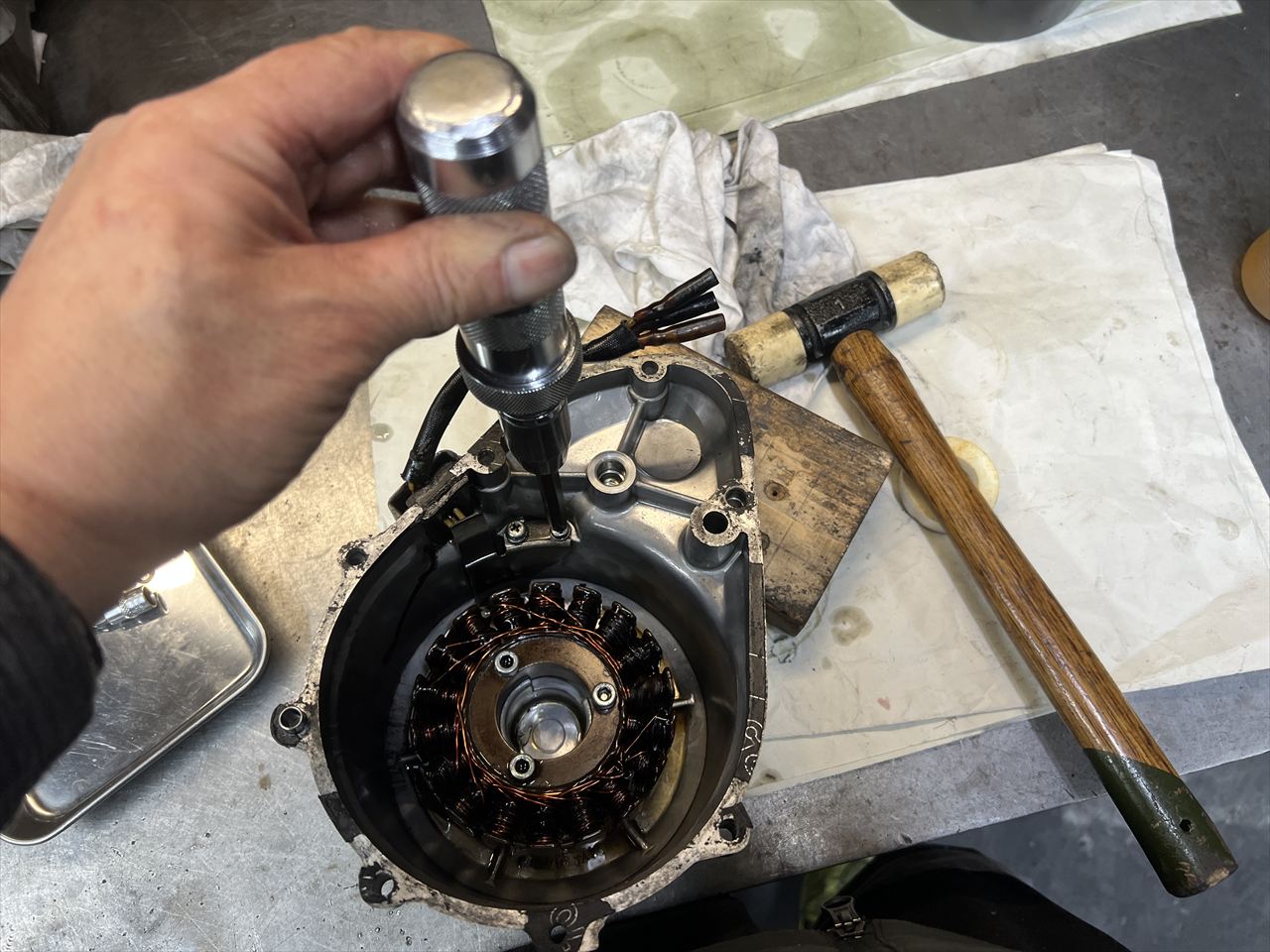 続いてジェネレータ周り。クランクのテーパーは傷ついており、ジェネレーターローターが空転していたようでした。