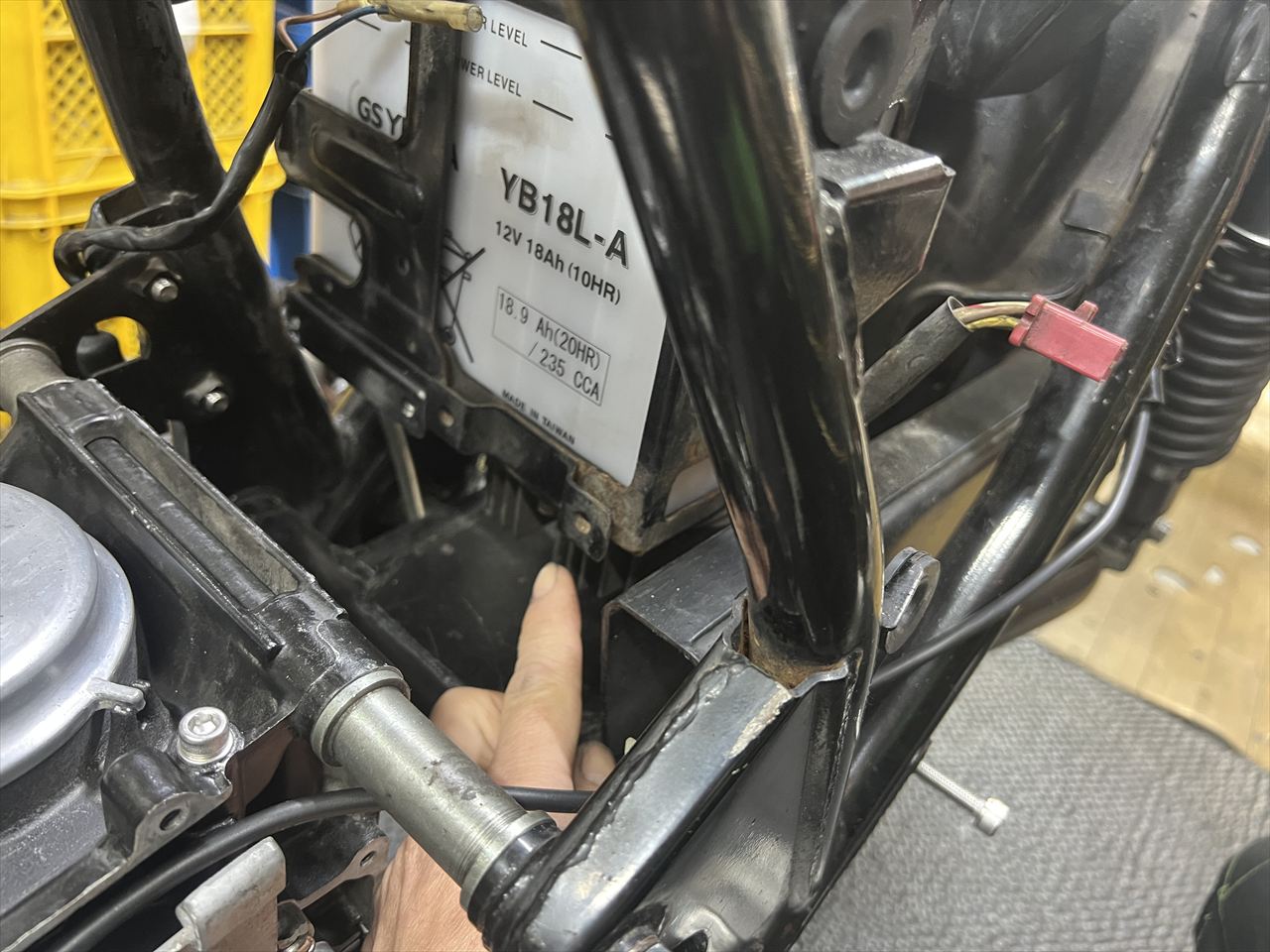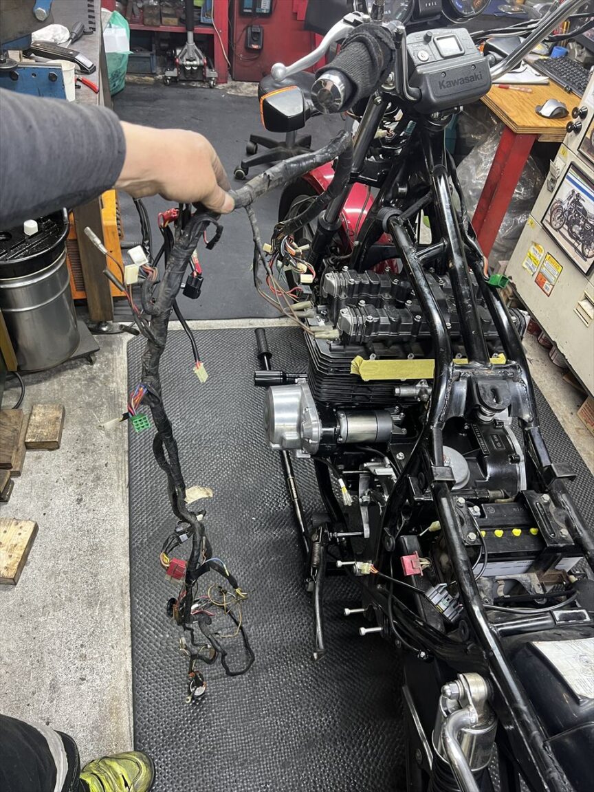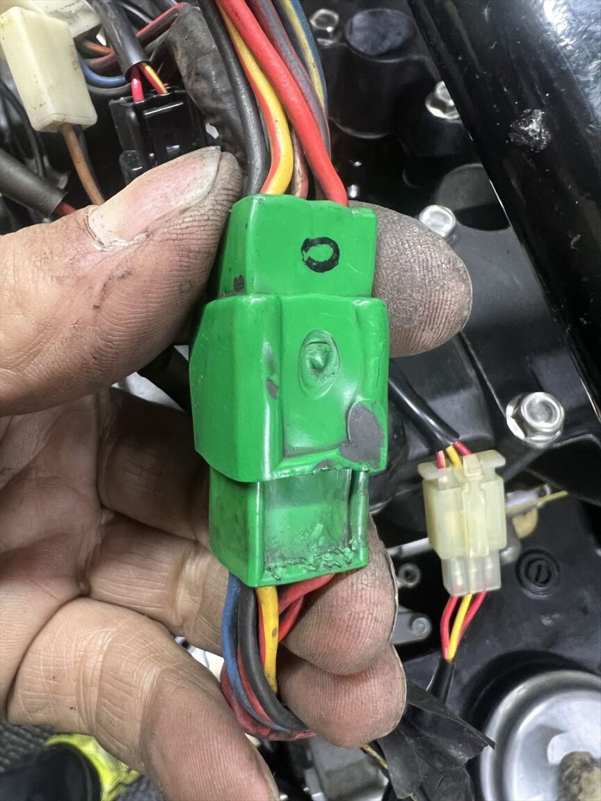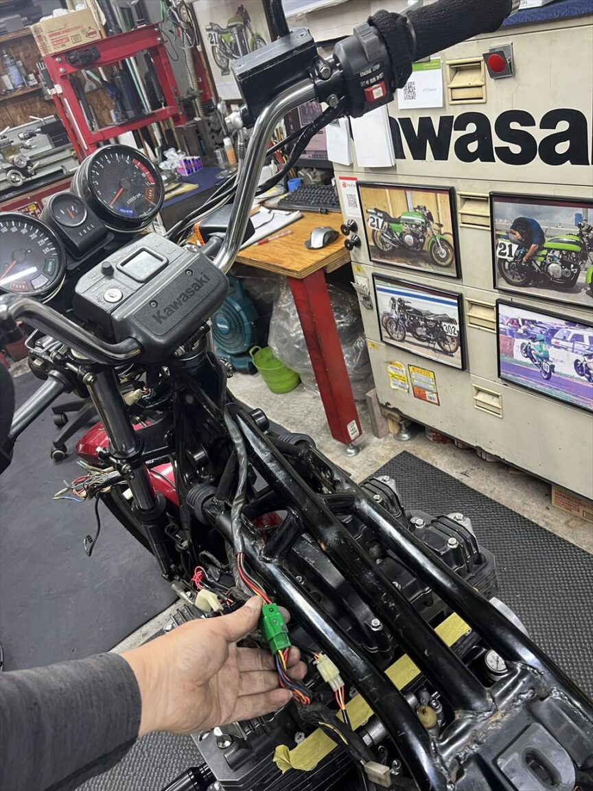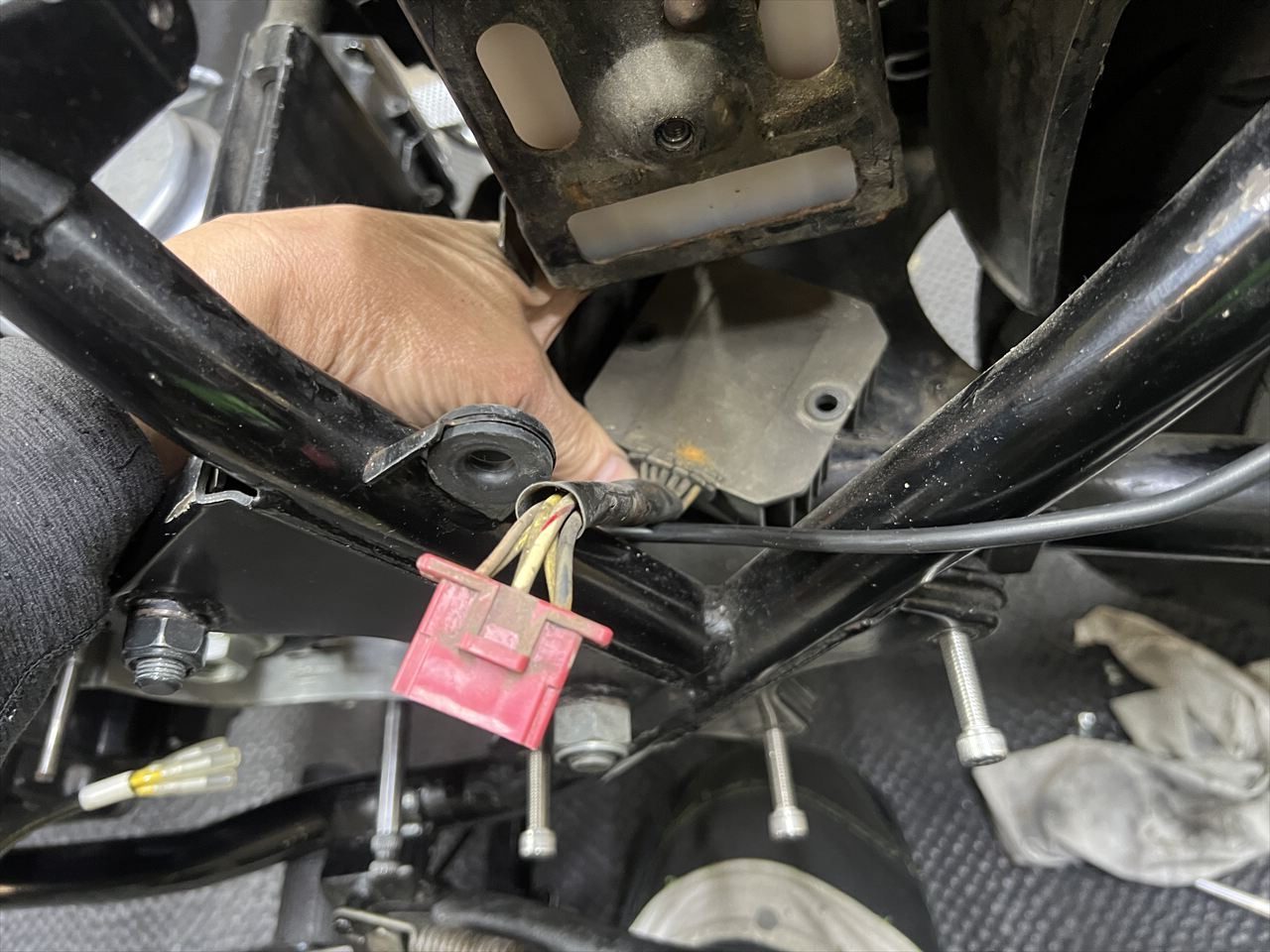 続いて電装系更新のためメインハーネスなどを外します。右のハンドルスイッチとメインハーネスのカプラーはかなり溶けていますね。更新はいいタイミングでしたね。