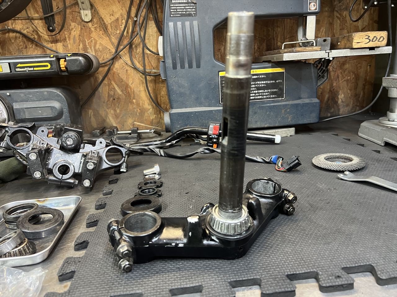 ステムは純正を使用。ベアリングは新品交換し、ロアーベアリング下にはダストシールとしてタンクキャップのパッキンを仕込みます。