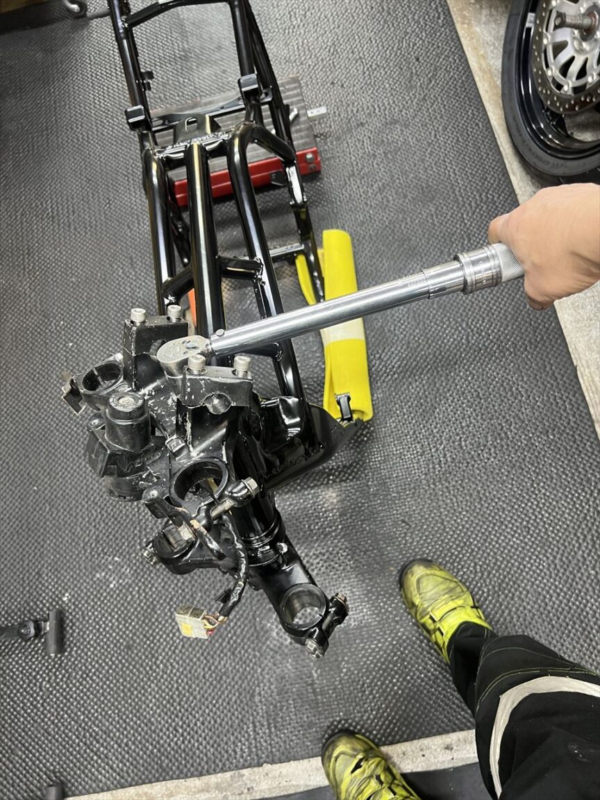 ステムを取り付けます。ステムナットの締め付けトルクは、ステムボルトを規定トルクで締めた状態で適正なプリロードになるようセットします。