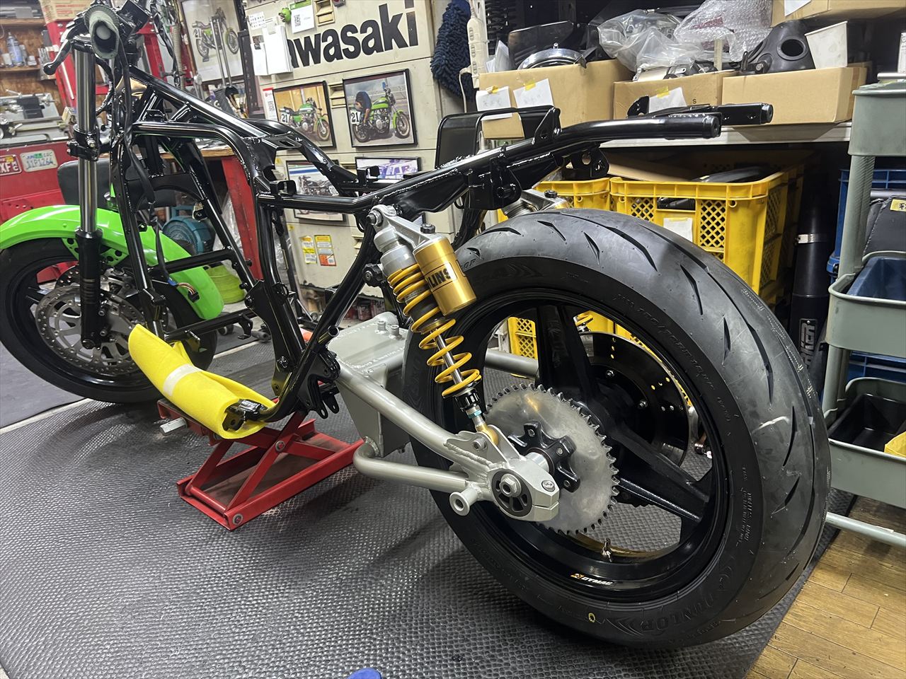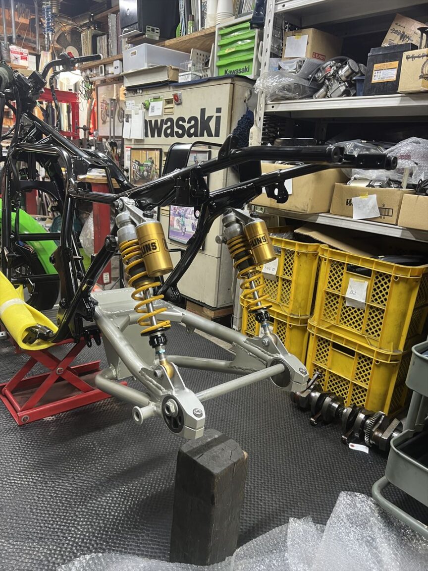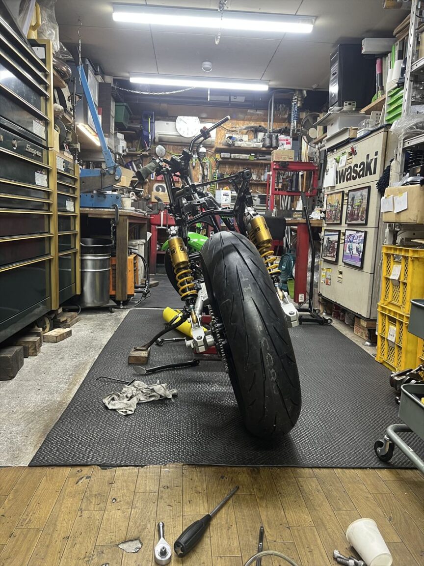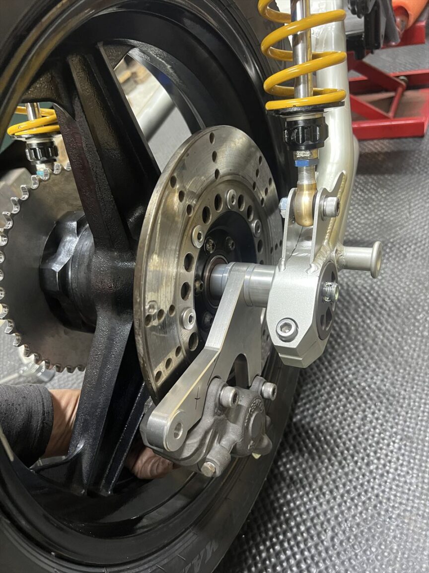 スイングアームは今回交換となり、ZRX400改S1スイングアームを選択。リヤショックは継続使用です。