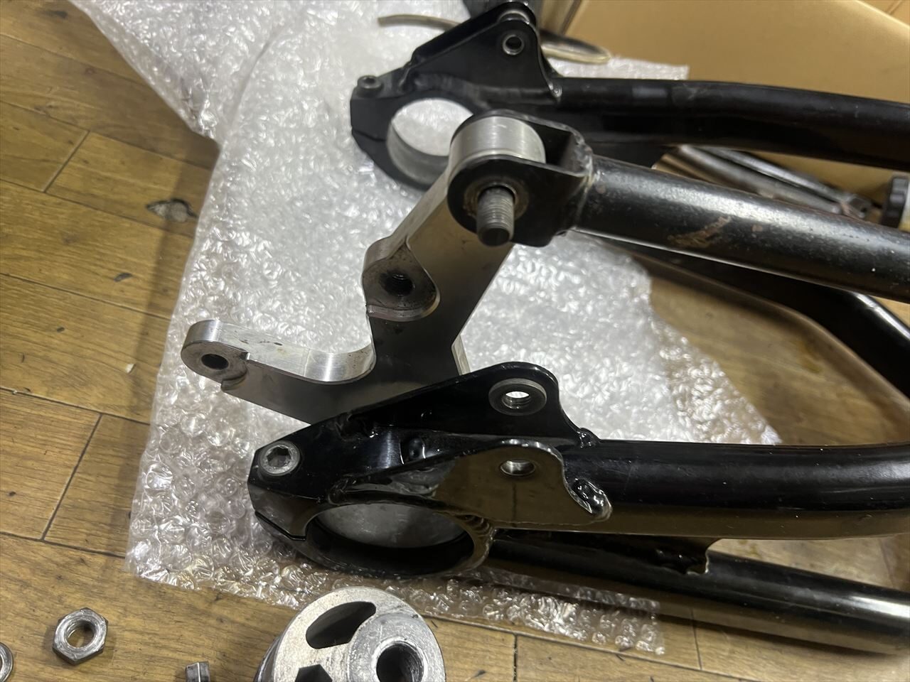 リヤブレーキ周りは既存の物を流用したいのですが、トルクロッドが上から下に変更になるので、そのままでは成立しません。