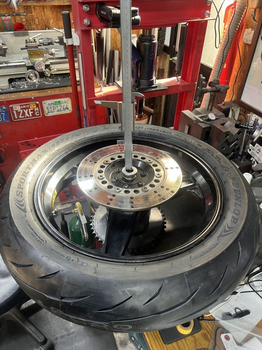 リヤホイール周りのアライメントを計測し、ホイールセンターが正確に出るようカラーの長さを微調整します。