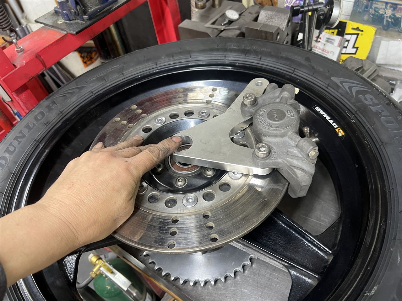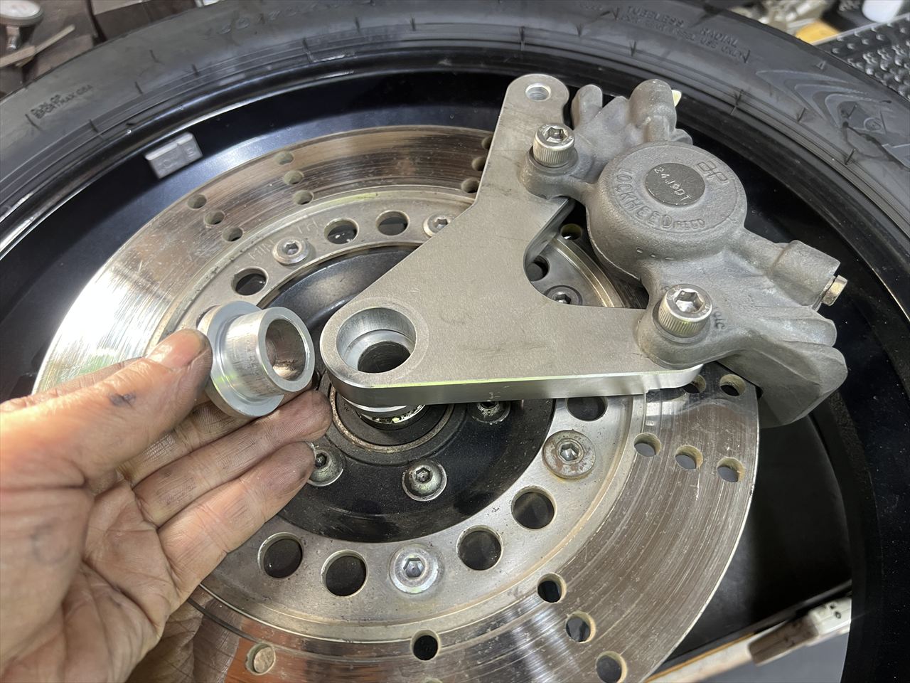 既存のリヤキャリパーサポートのカラーは圧入だったので、エキセントリックタイプのチェーン引きだと整備性が非常に面倒になります。これはスイングするタイプに改造します。