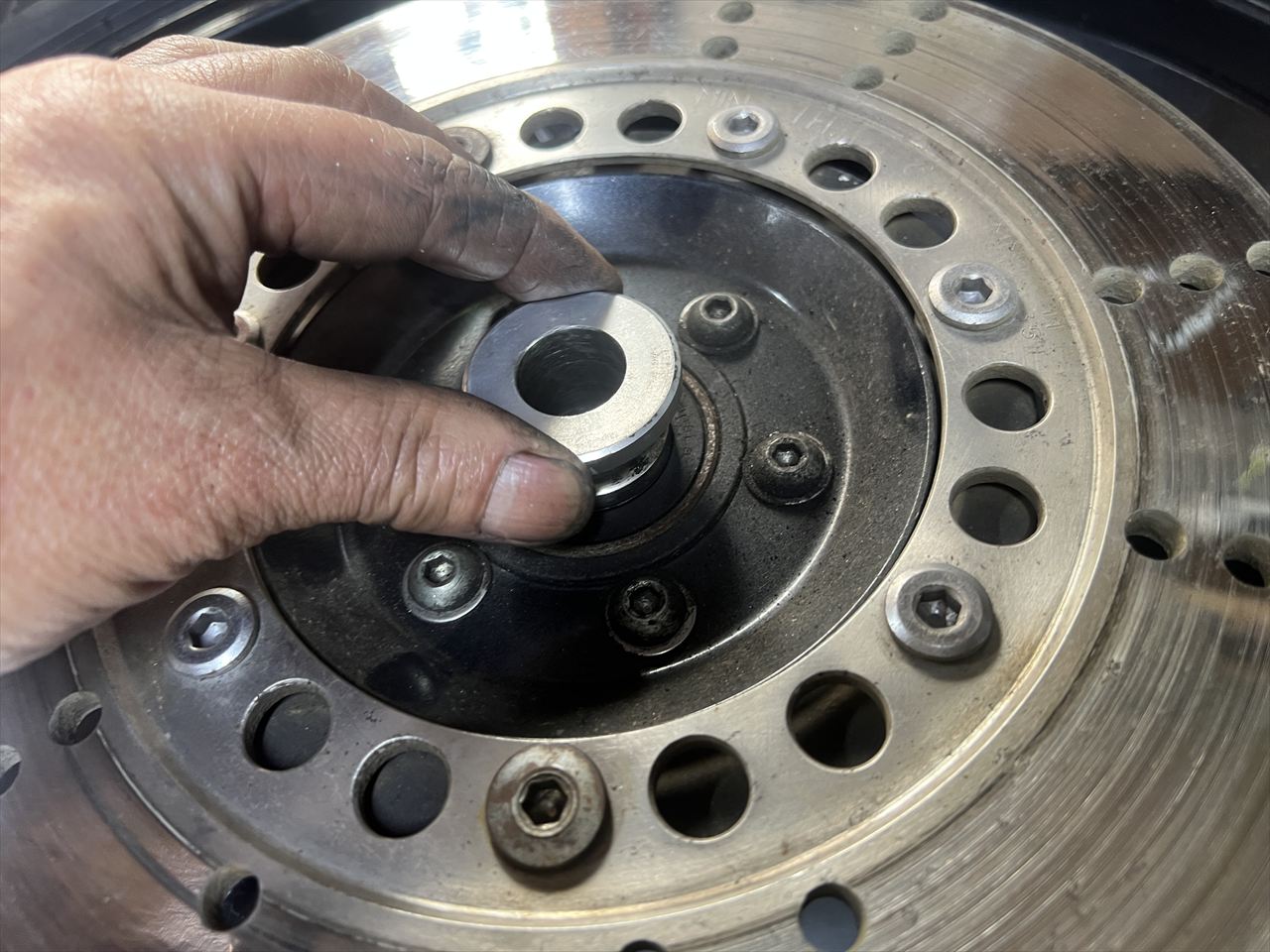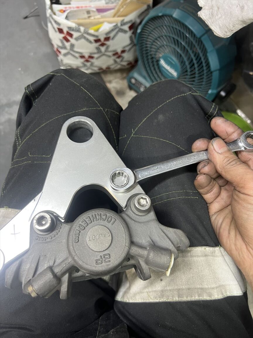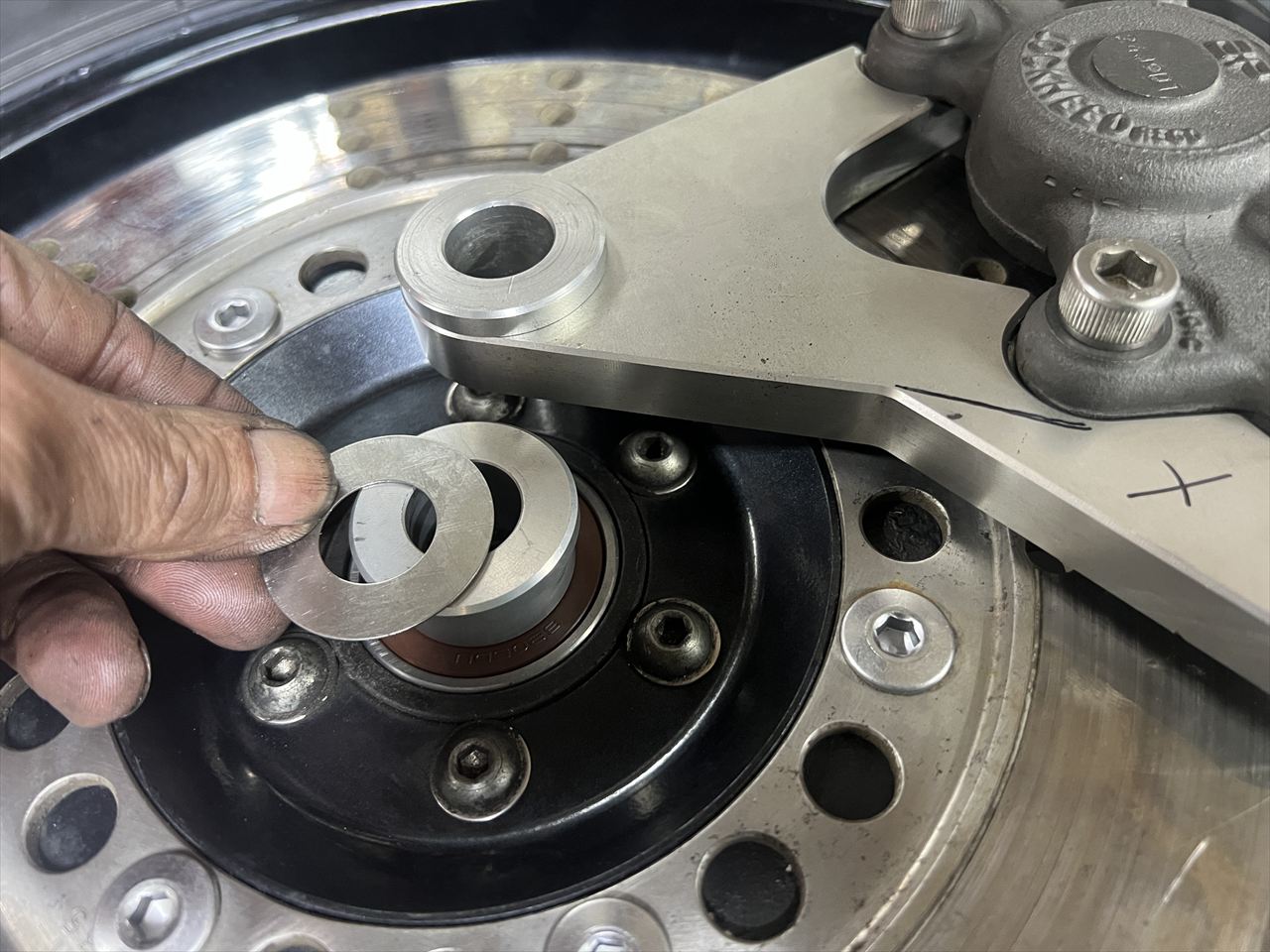 ローターとキャリパーのセンターが合うようカラーの厚さを決めるため、シムを入れて検討します。
