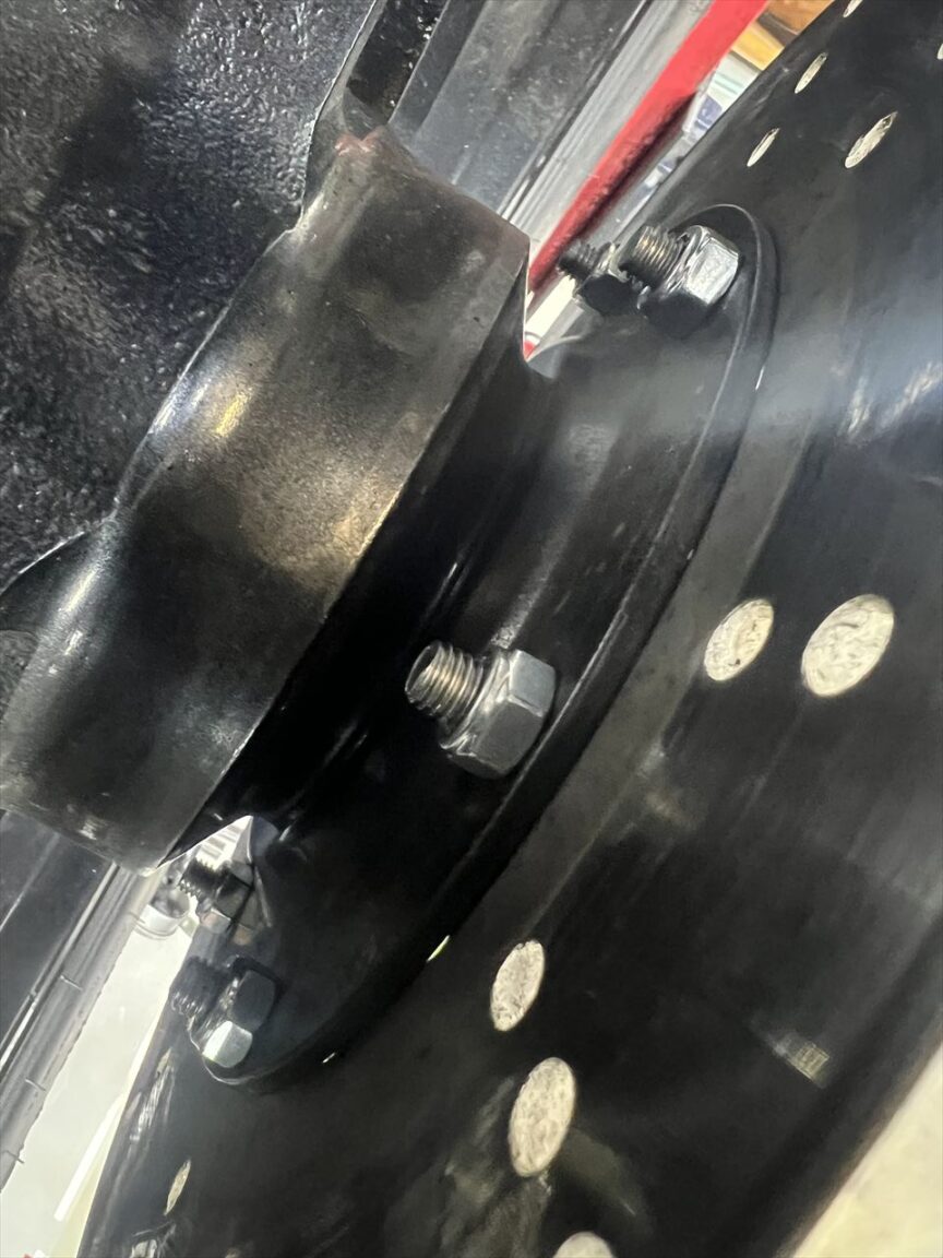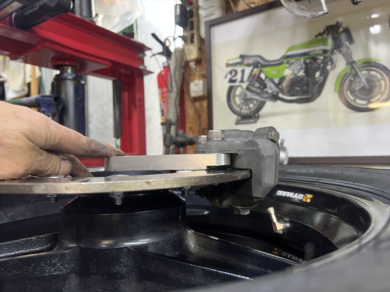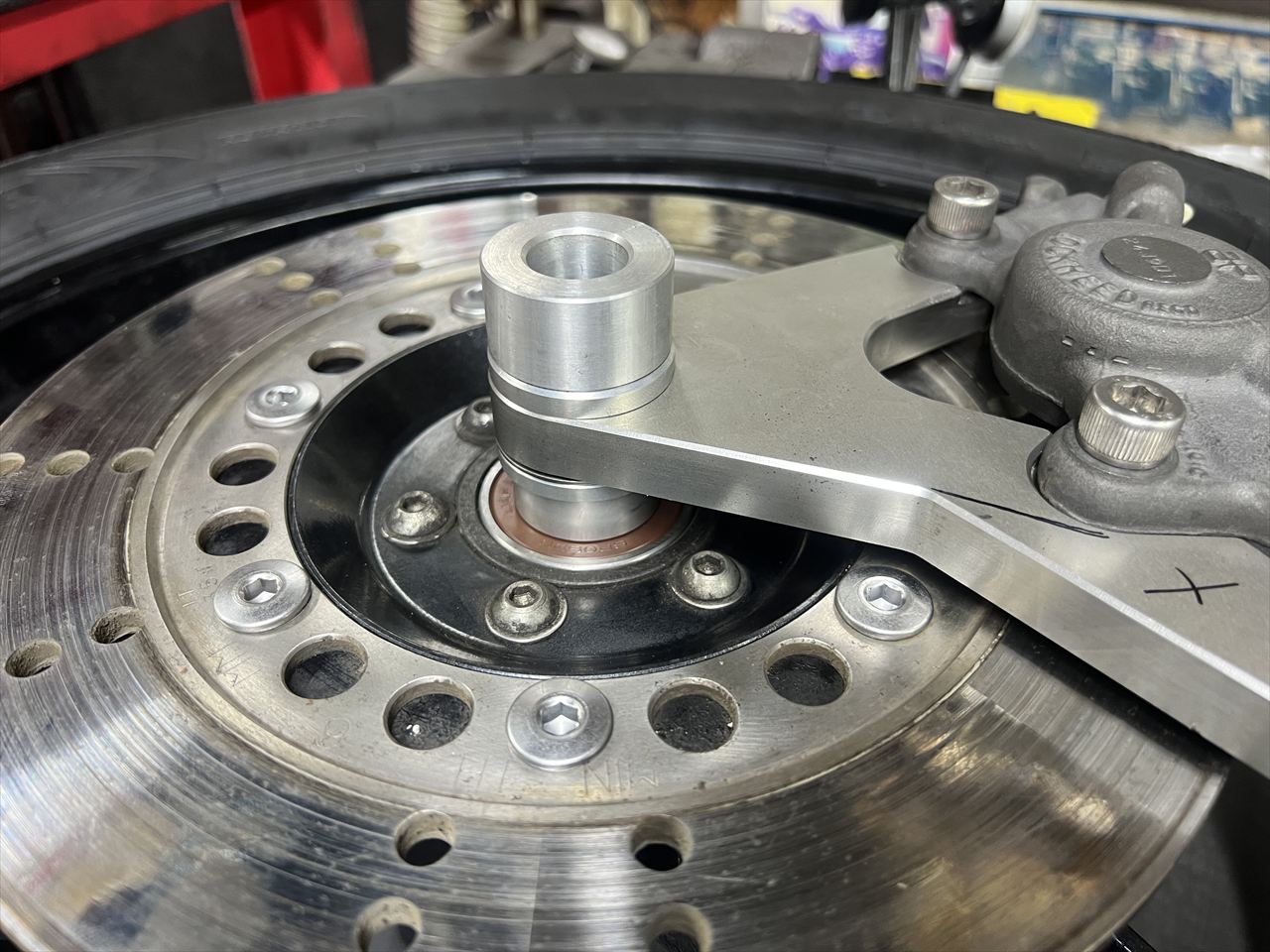 ローターとキャリパーのセンターが合うようカラーの厚さを決めるため、シムを入れて検討します。