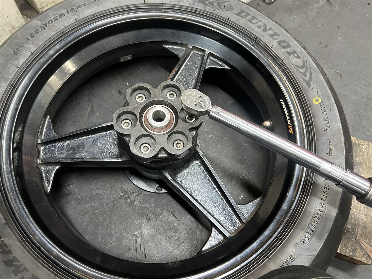 リヤホイールは一旦仮付けでフレームを立ち上げます。