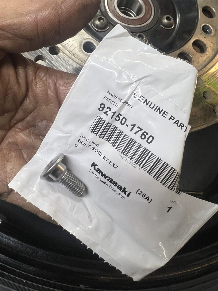 ローターボルトは収まりのいいこちらのカワサキ純正品に変更します。首下長さは20ミリです。