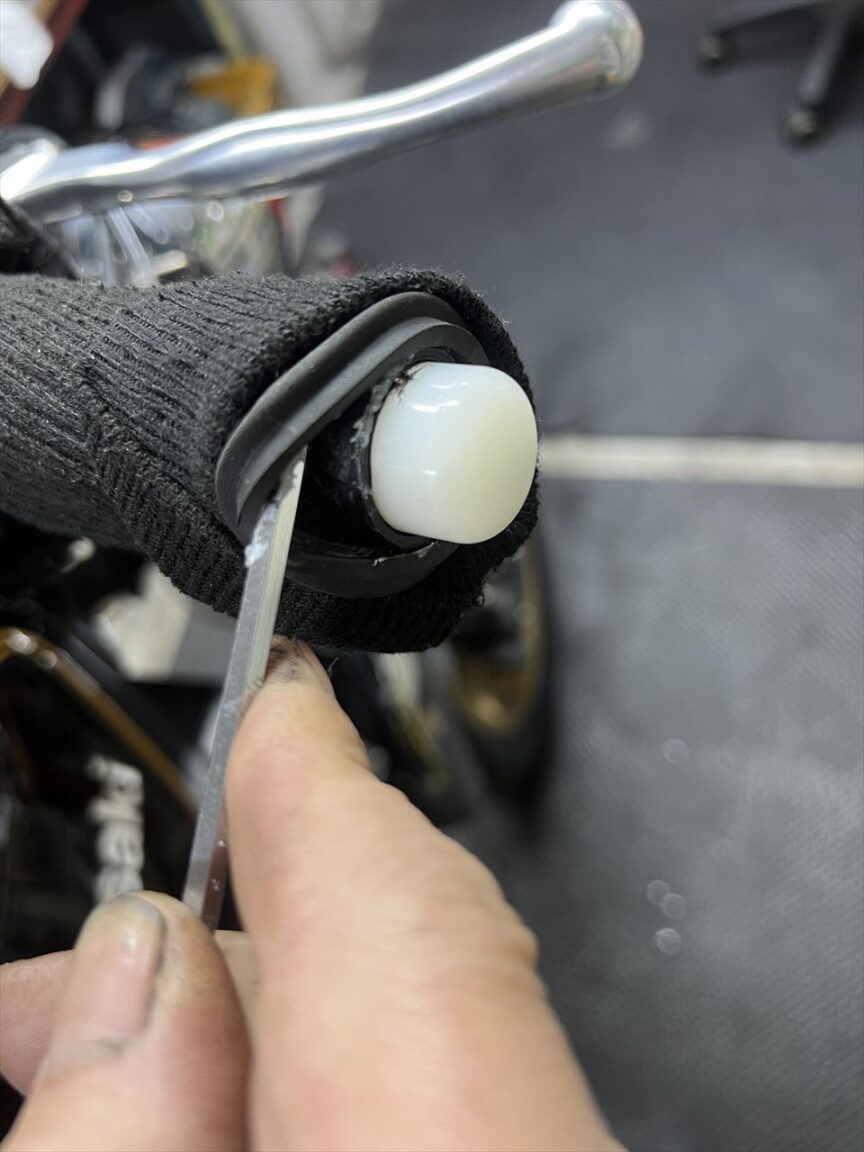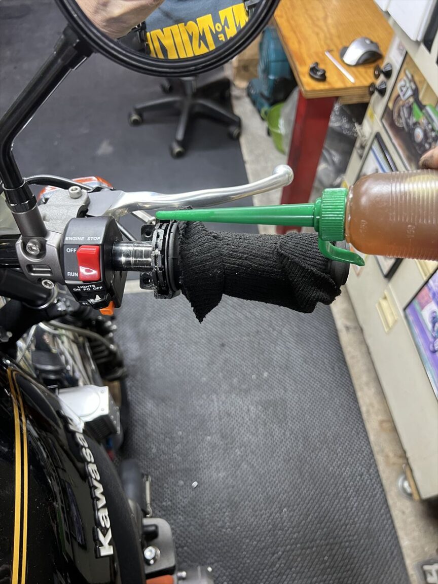 スロットル操作がまだ少し渋いので、スロットルホルダーからはみ出したグリップの内側にグリスを塗り、グリップのゴムとハンドルが直接触れないようにします。