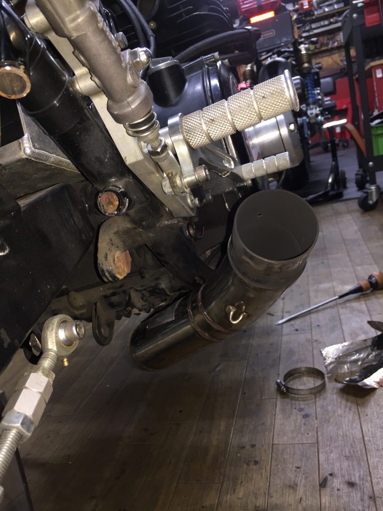 奥まで挿入した状態だと、パイプがフレームに当たり全く元のレイアウトにはなりません。中間パイプは切断して向きを変える処置が必要です。