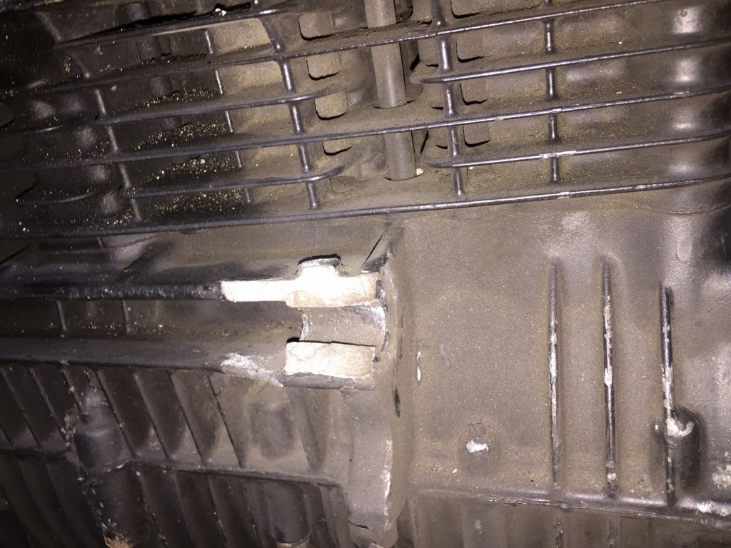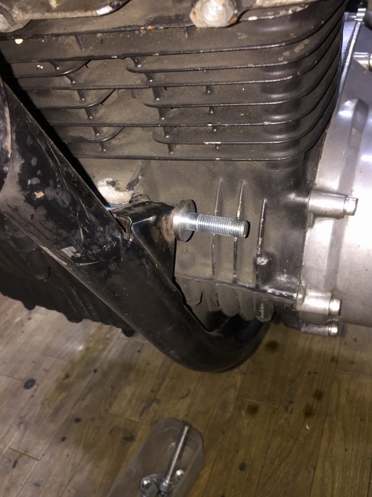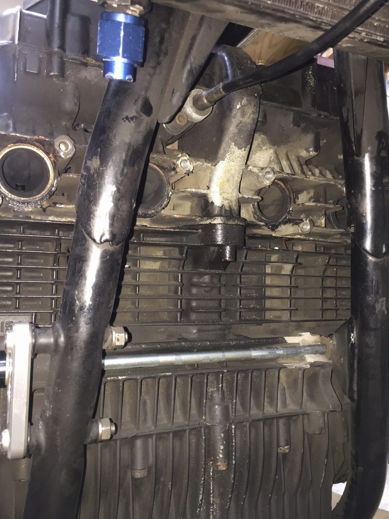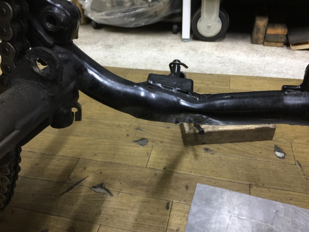 エンジンマウントのひとつが大きく欠けています。フレームには大きな損傷は見られないので、いつ頃どうしてケースだけ欠けたのか不明とのこと。