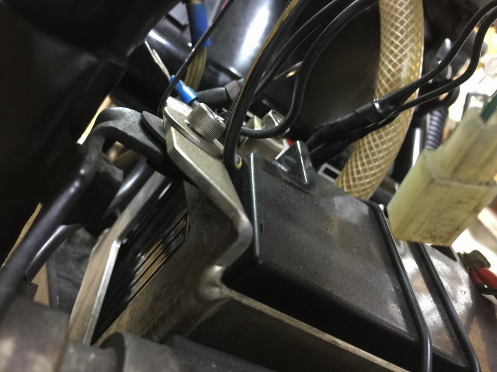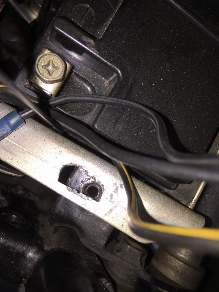 右側のエンジンマウントプレートを外す際、バッテリーケースのボルトが斜めになっているのに気が付きました。