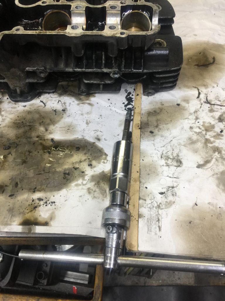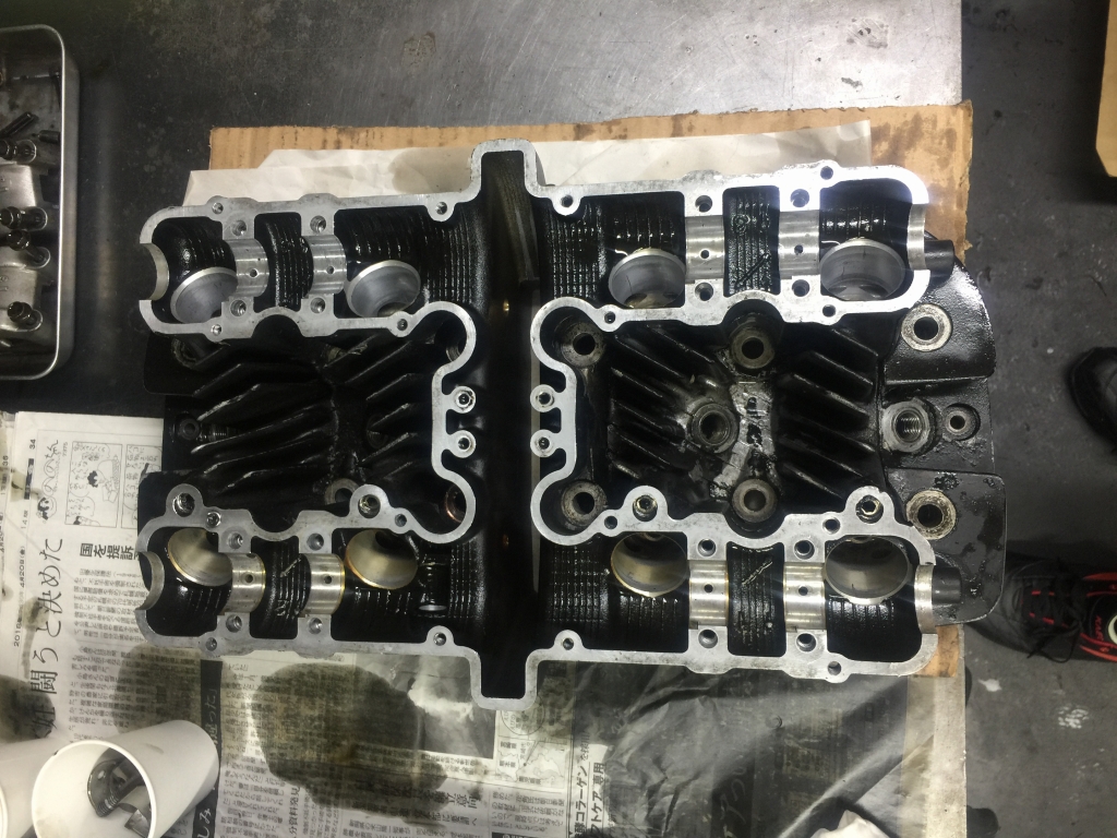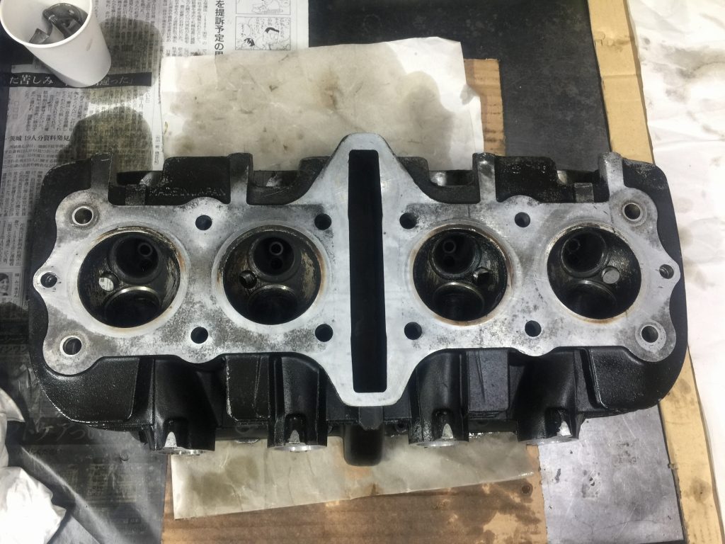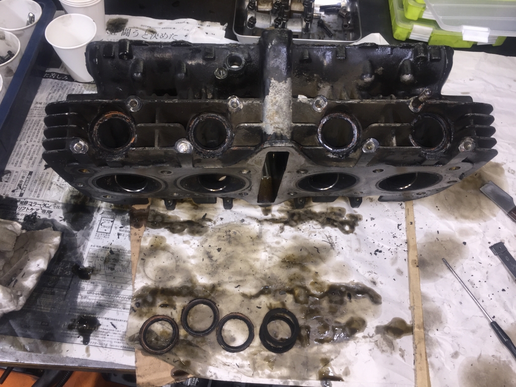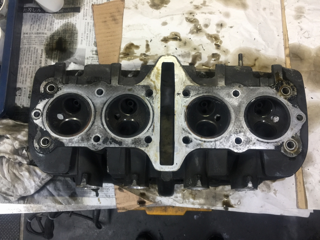 このあと硬化したベースガスケットを慎重に剥がしますが、1時間でやっと半分くらいしか剥がせないペース。続きは明日に。仕様は純正0.5ミリオーバーサイズピストンとなりました。