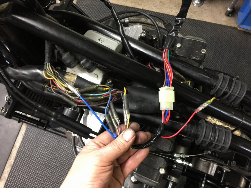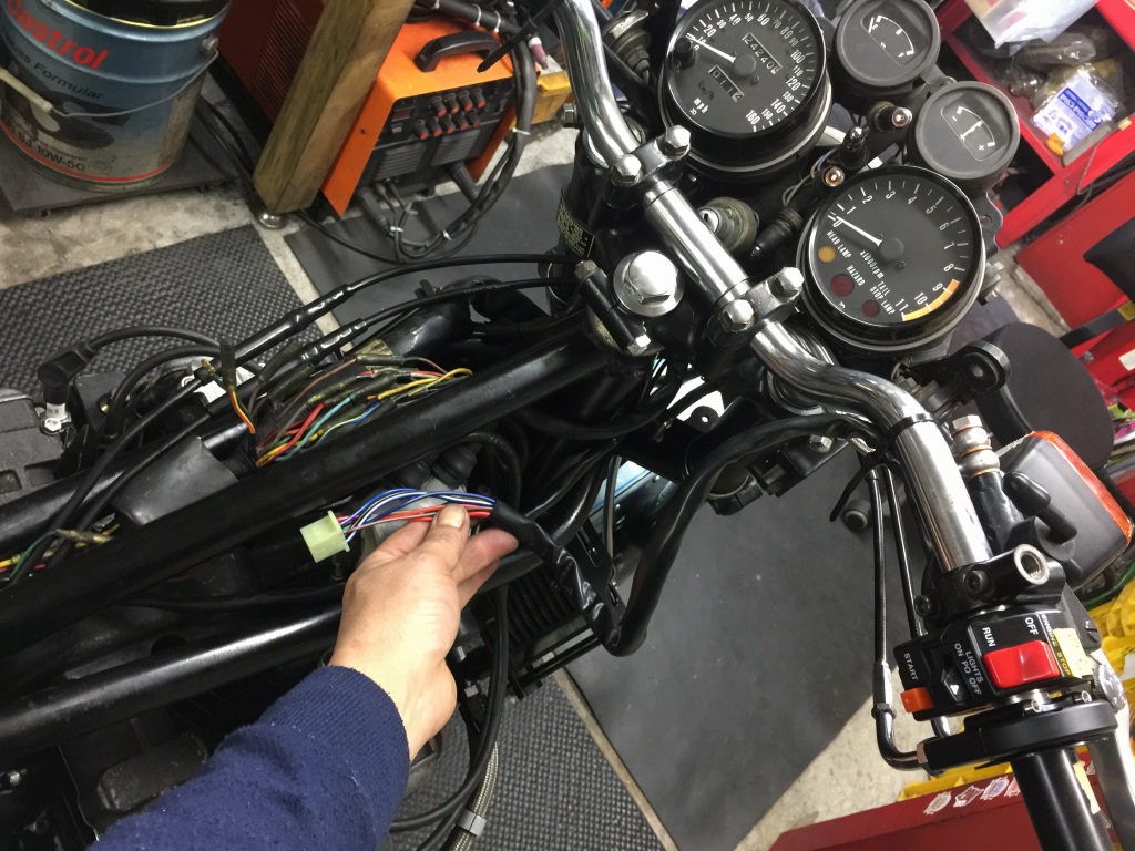 左側は純正のままで、一部がハンドル内蔵式のためバラ線になっています。