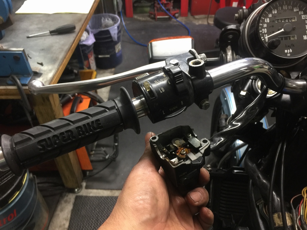 左のハンドルスイッチも、動きが渋いので内部を潤滑します。