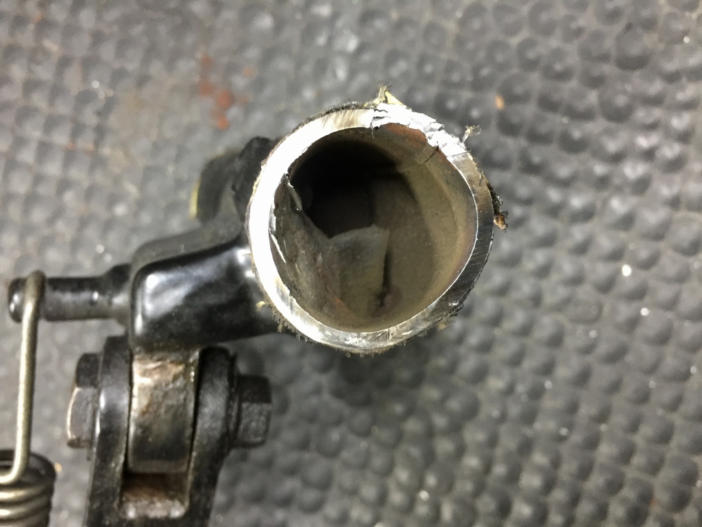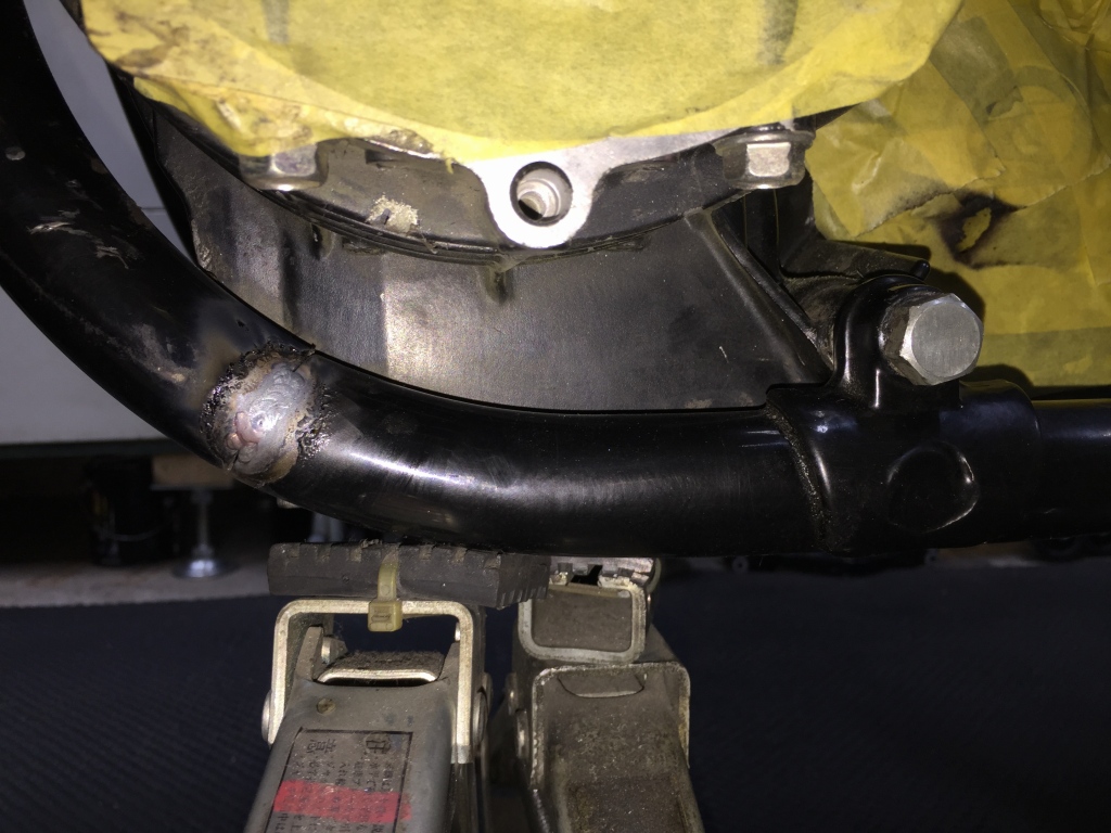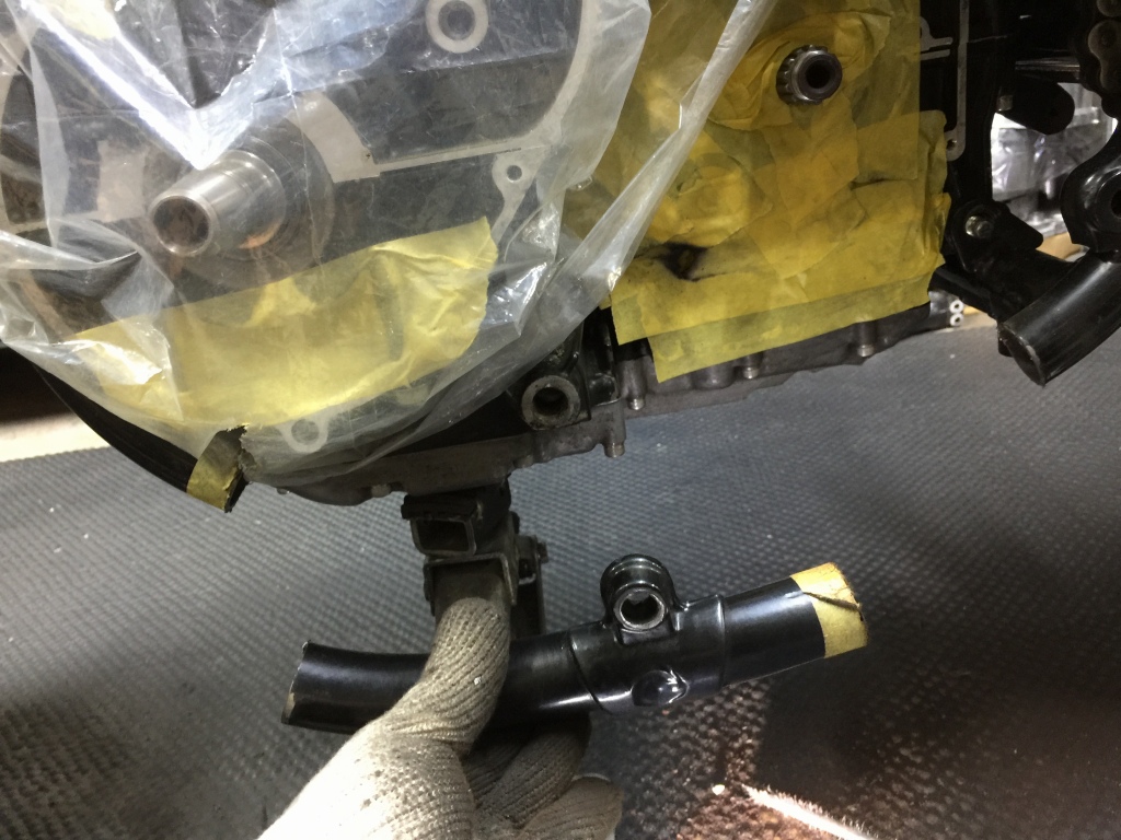 この、サイドスタンドブラケット周辺のフレームの変形は、思いの外ダメージが大きかったようで、左前と左下のエンジンマウントが大きくズレています。