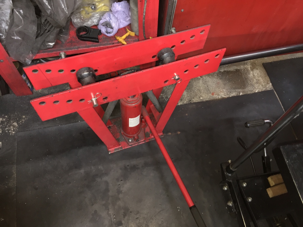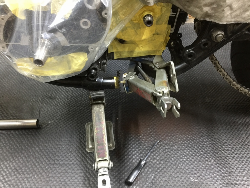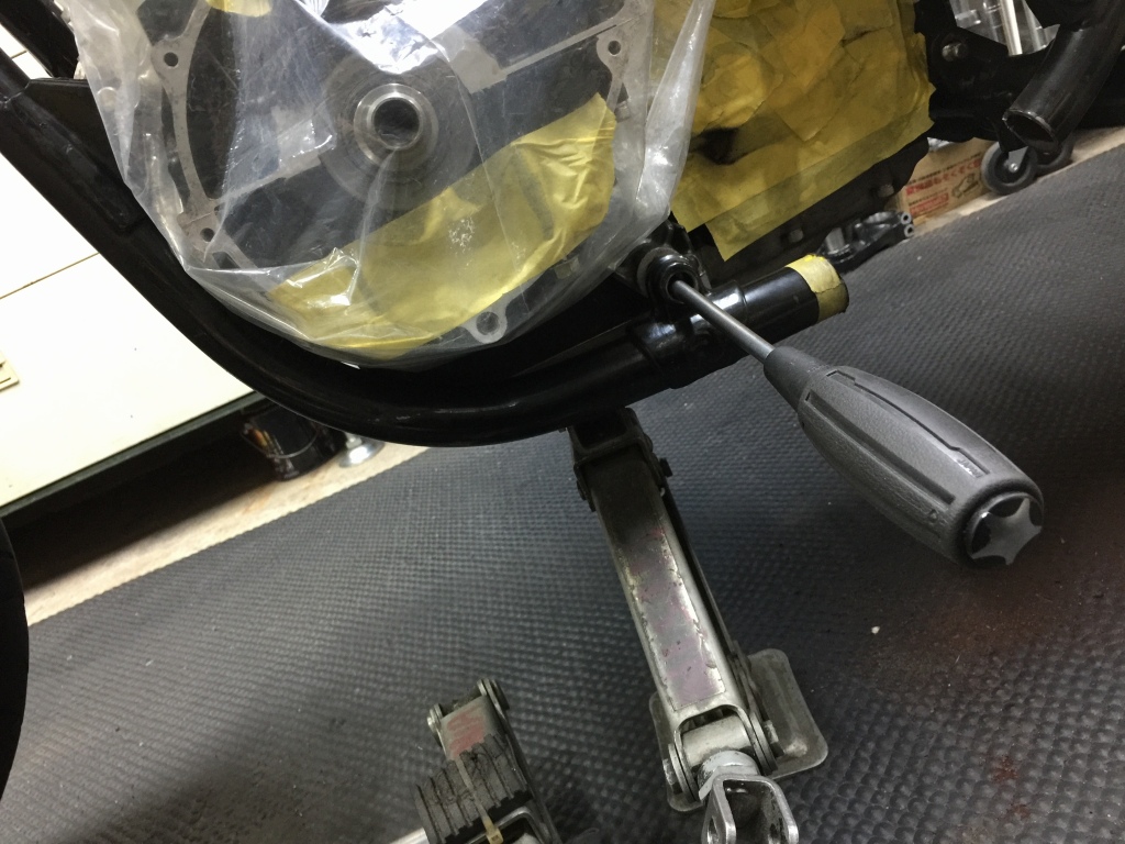 過去の転倒によるものか、新しいクランクケースで組んだエンジンのマウント位置が合いません。そこでフレーム修正します。