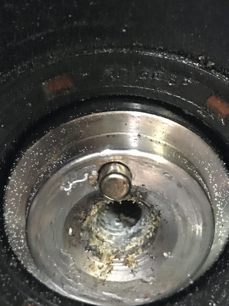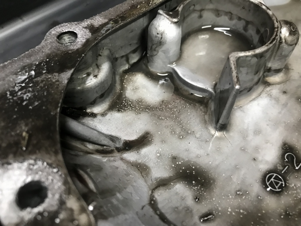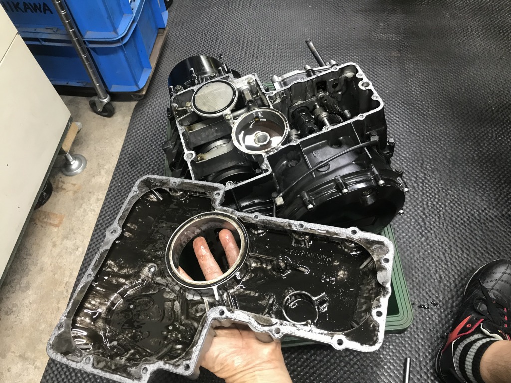 この炭のような黒い汚れは、オーバーホール後約1000キロしか走っていないので経年で溜まったスラッジではなく、摩耗で出たアルミ紛が酸化して黒ずんだものだと思われます。