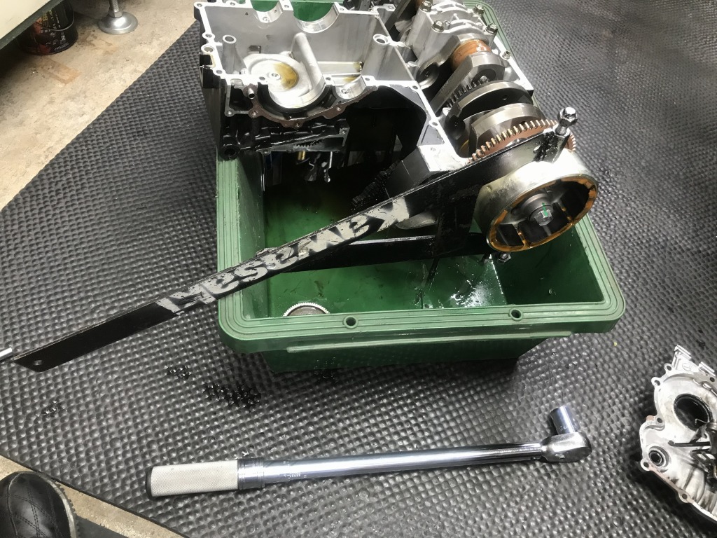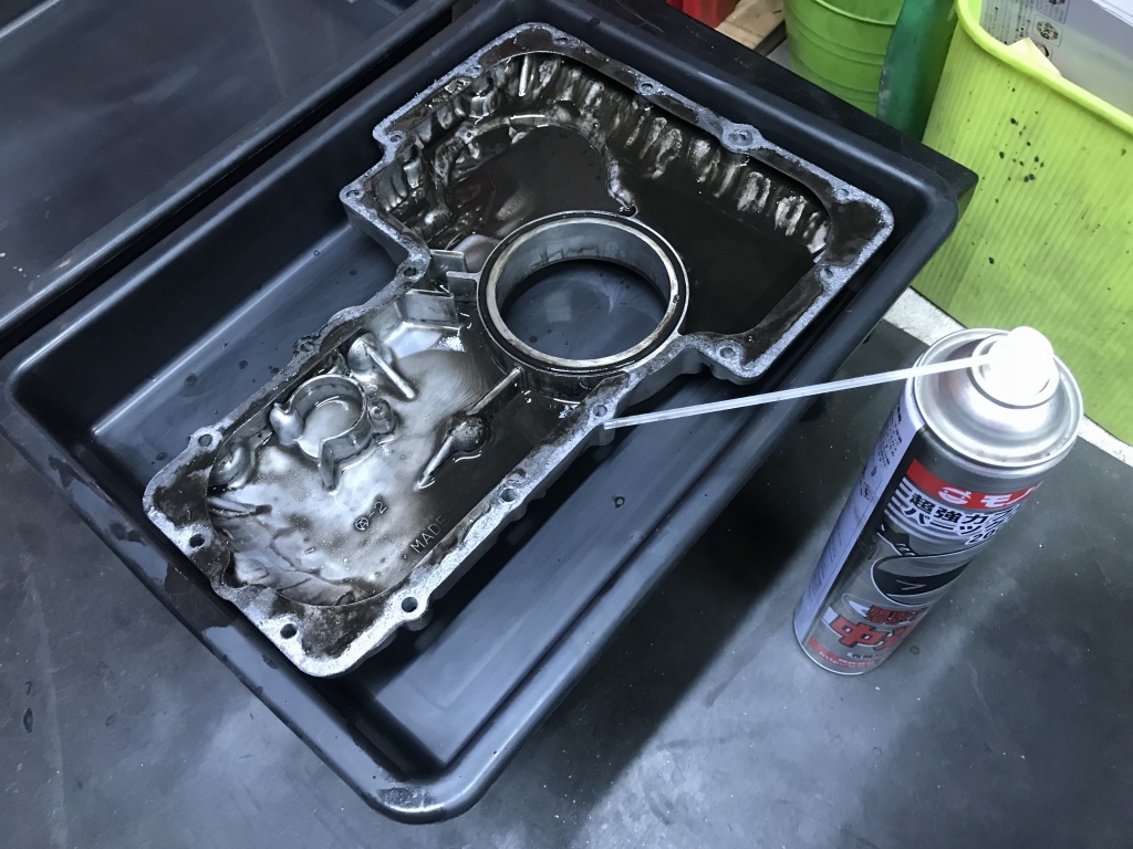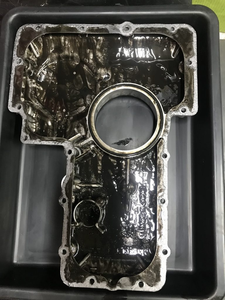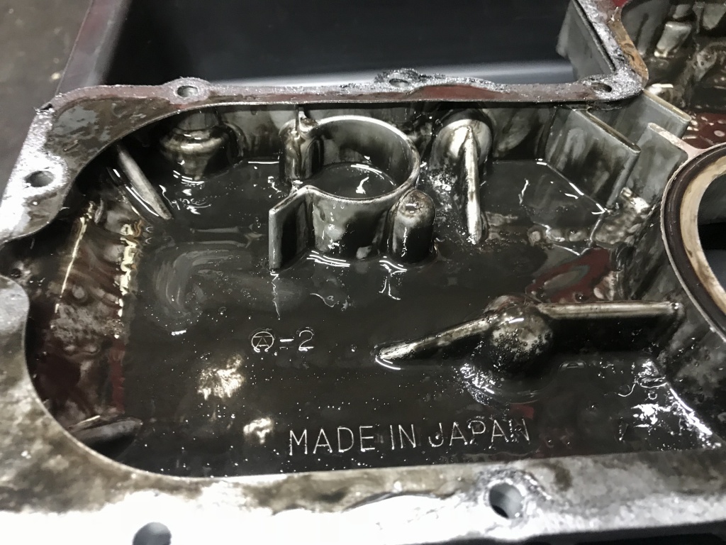 オイルパンを外します。抜いたオイルにも相当メタリックな粒子が混じっていましたが、オイルパンの底にもスラッジ状のメタリック粒子が堆積しています。
