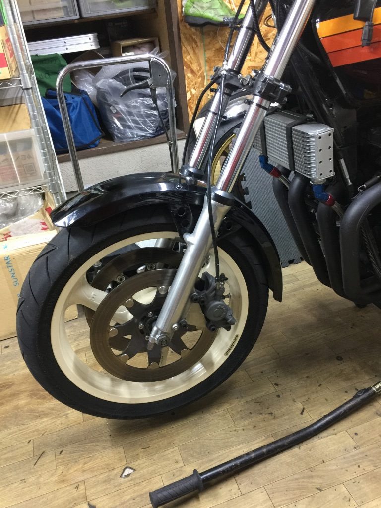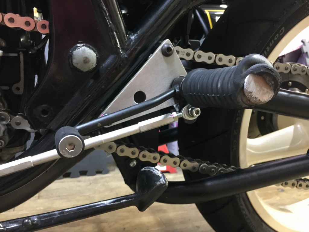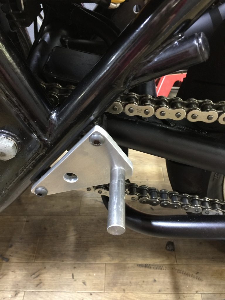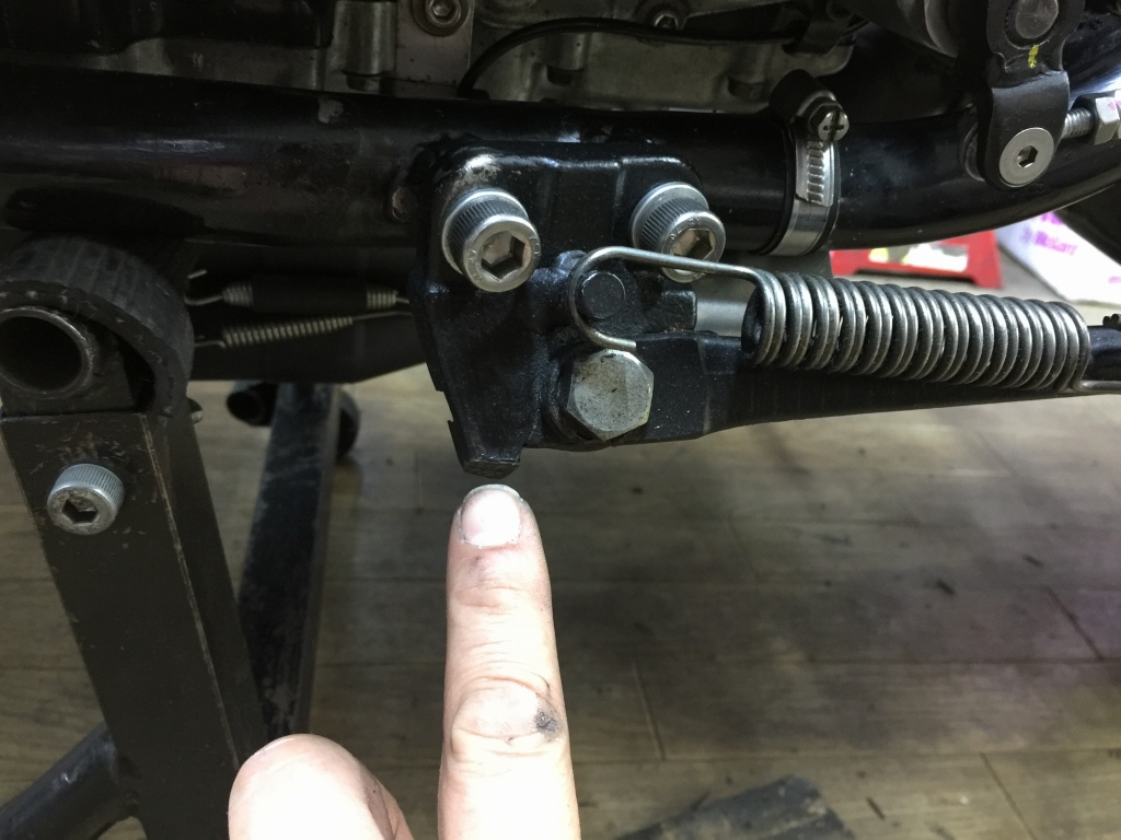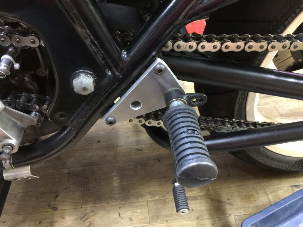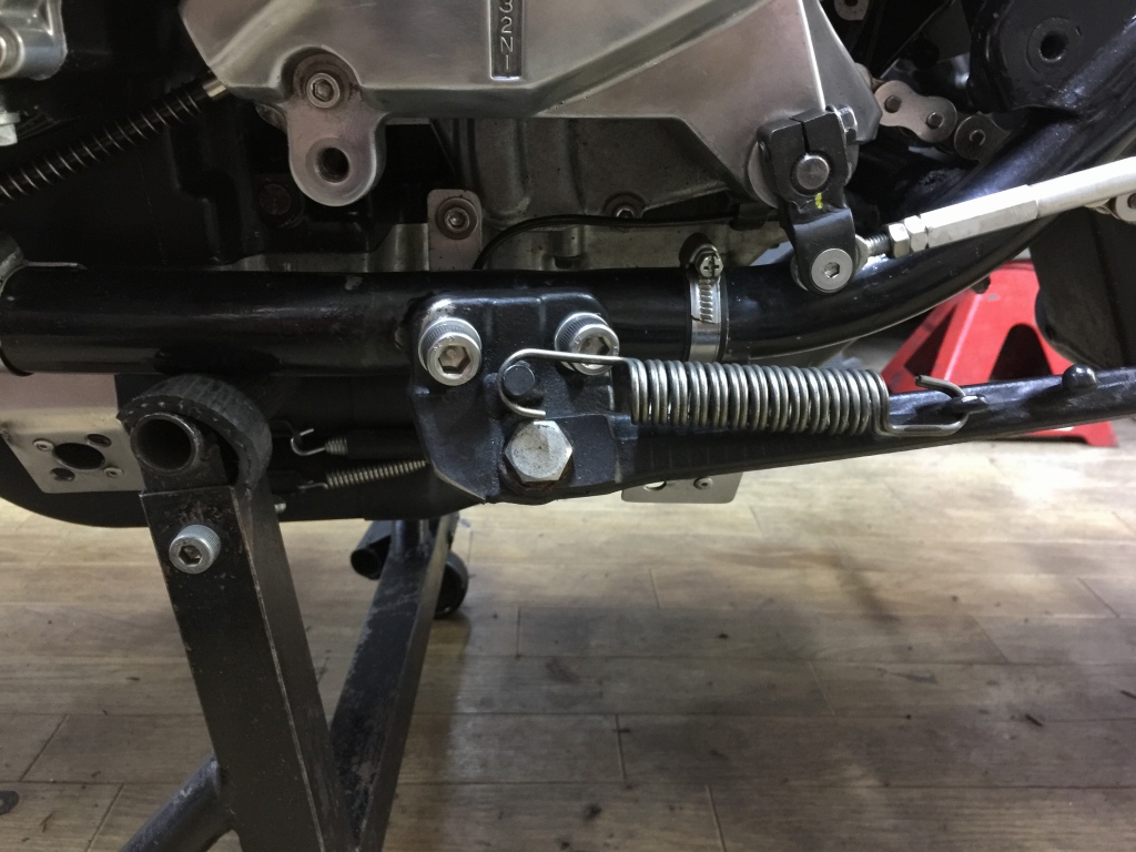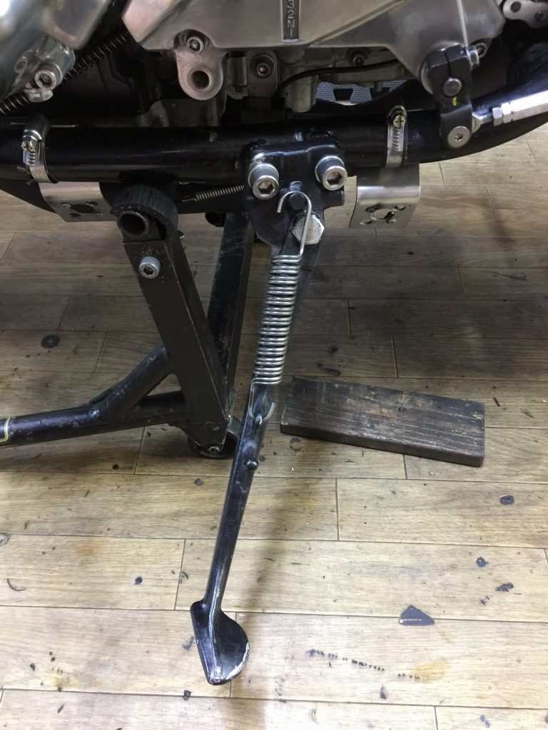 サーキットではスタンドごと外すのでバンク角は問題ありませんが、ストリート用にもう少しバンク角を稼いでおきます。