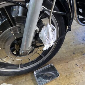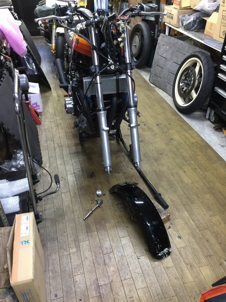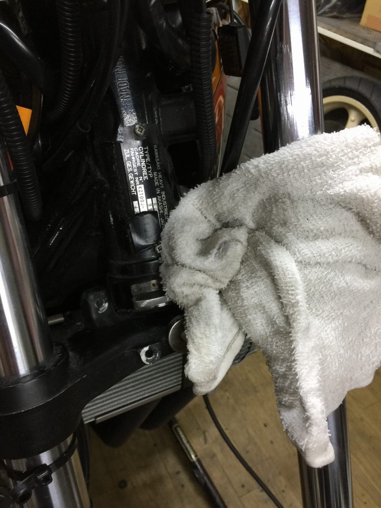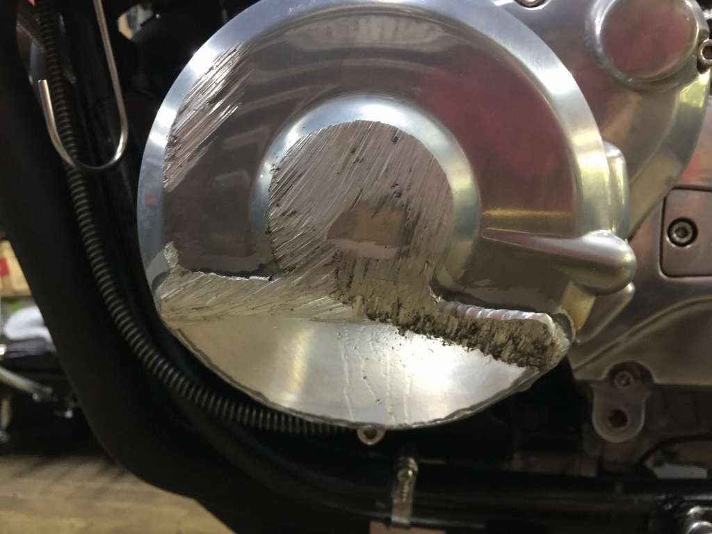 他にも、ジェネレーターカバーが削れ、左ステップもプレートごと曲がっています。