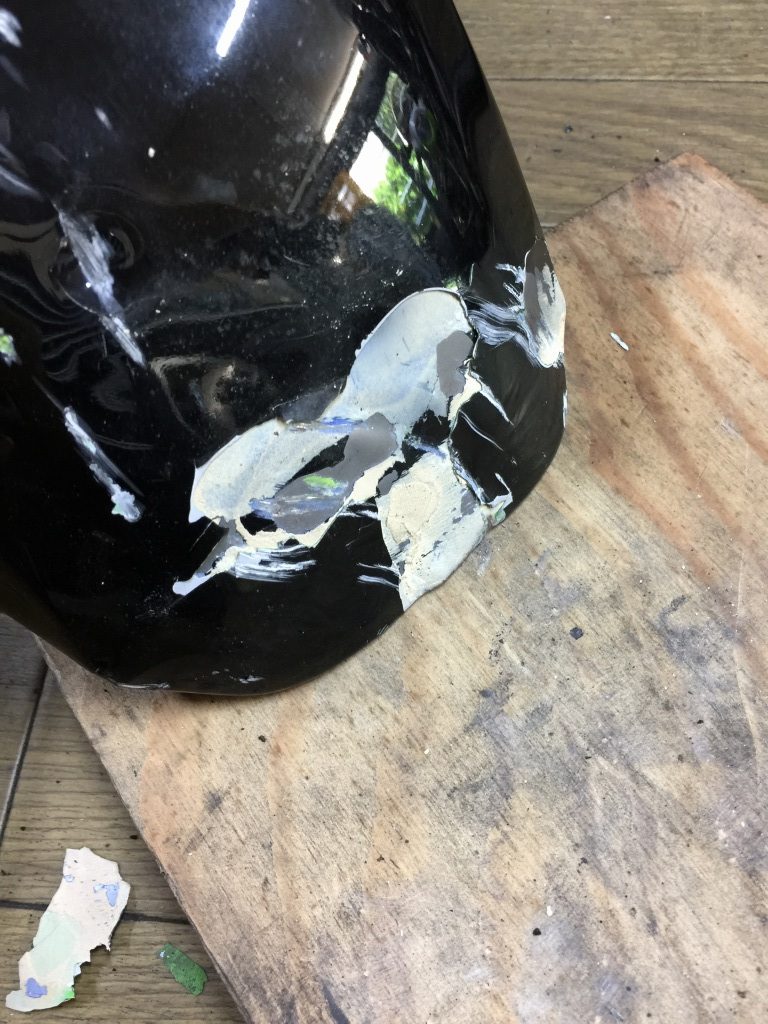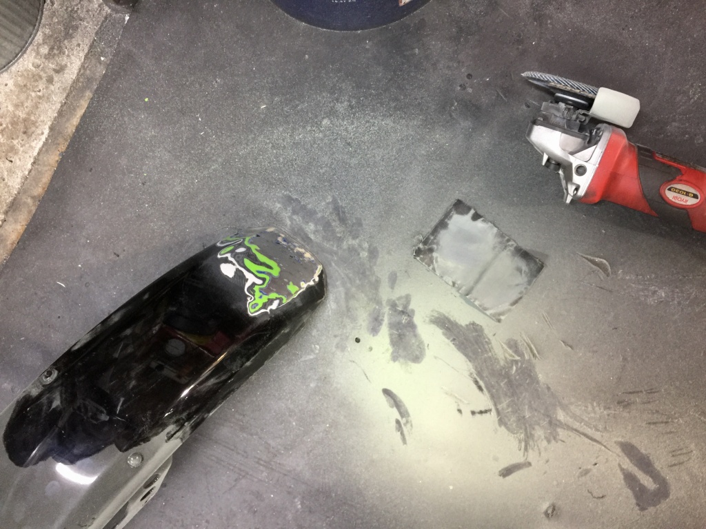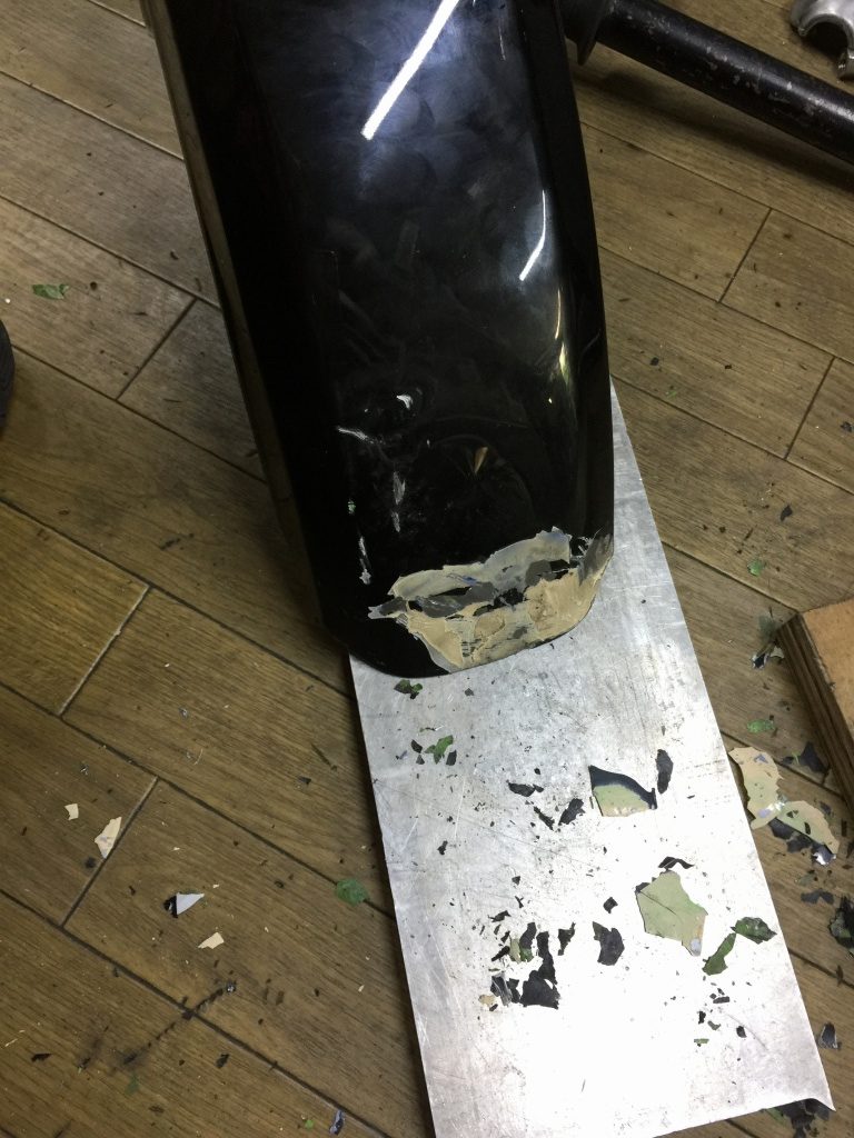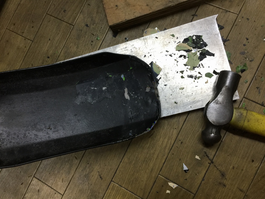 暫定的な修理で良いとのことで、剥がれそうな塗装とパテ盛りを落とします。