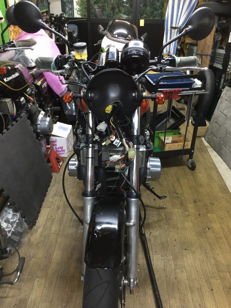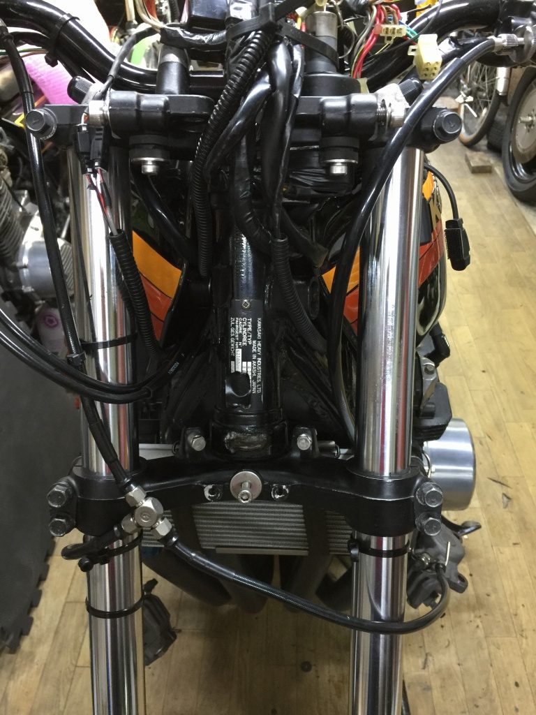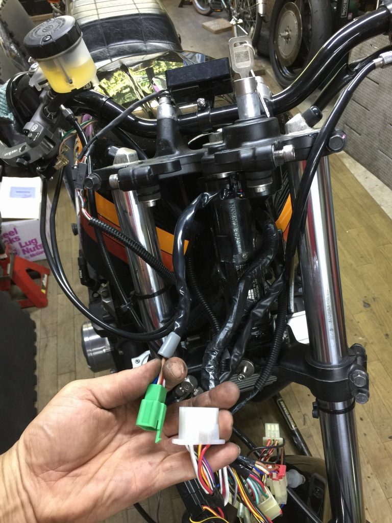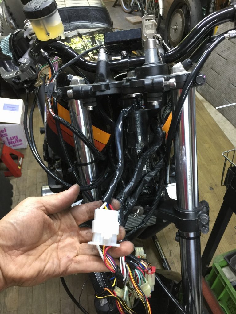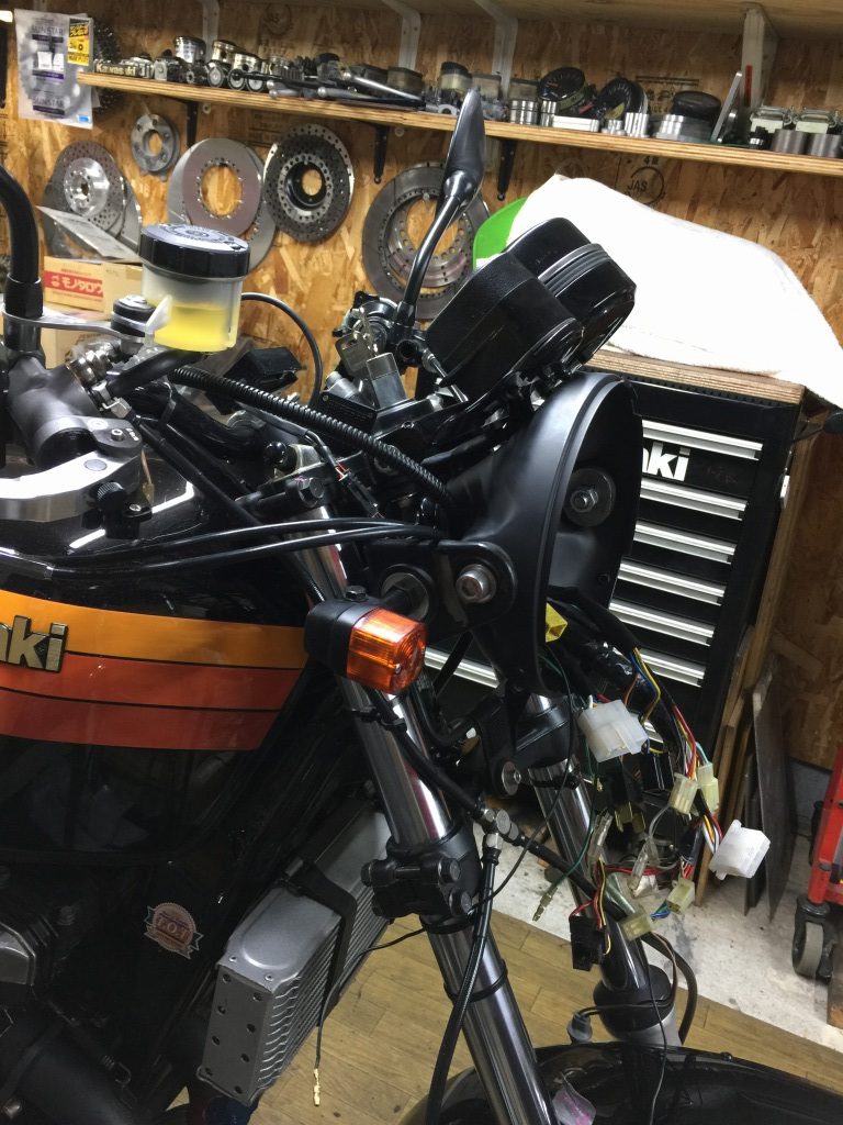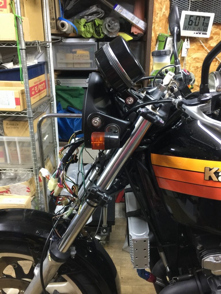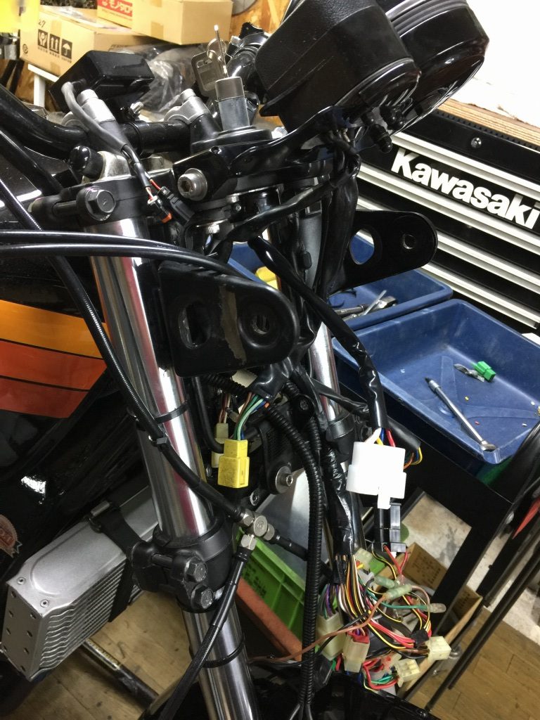 ステムへの取り付けはボルトオンです。カプラーが違うので配線は加工が必要です。こちらのメインハーネスはZ1000R2純正品。