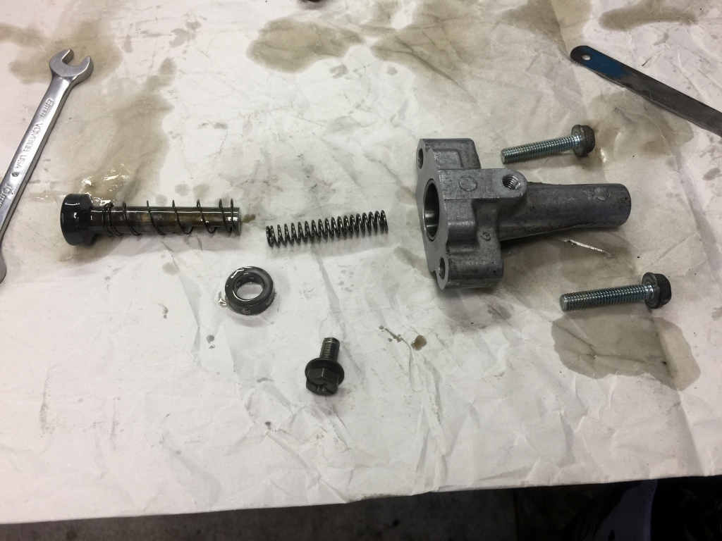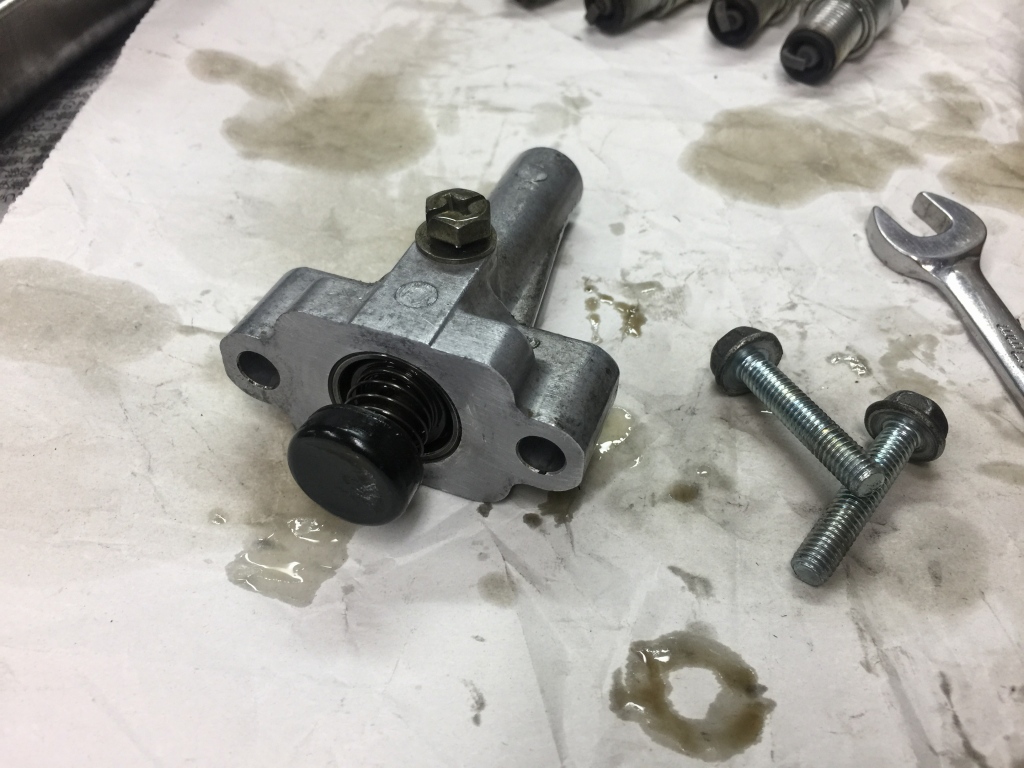 ヘリサート修理が終わり、カムチェーンテンショナーを点検します。