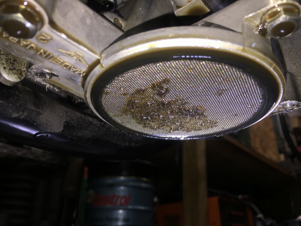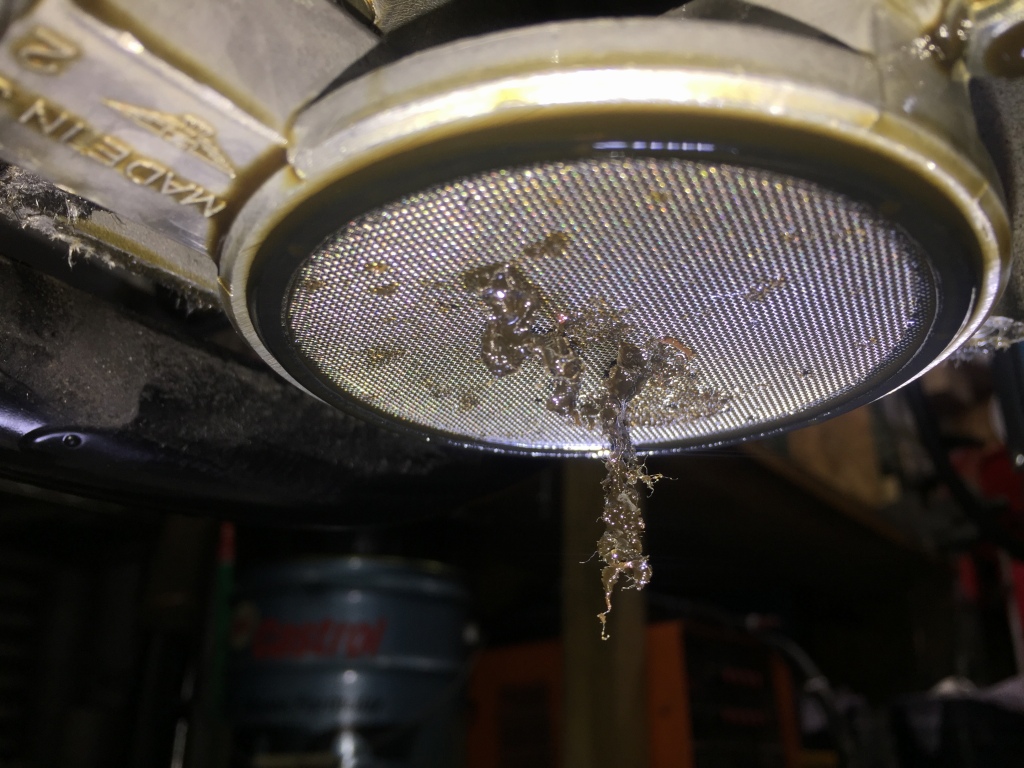 オイルストレーナーには繊維状の異物が付着しています。
