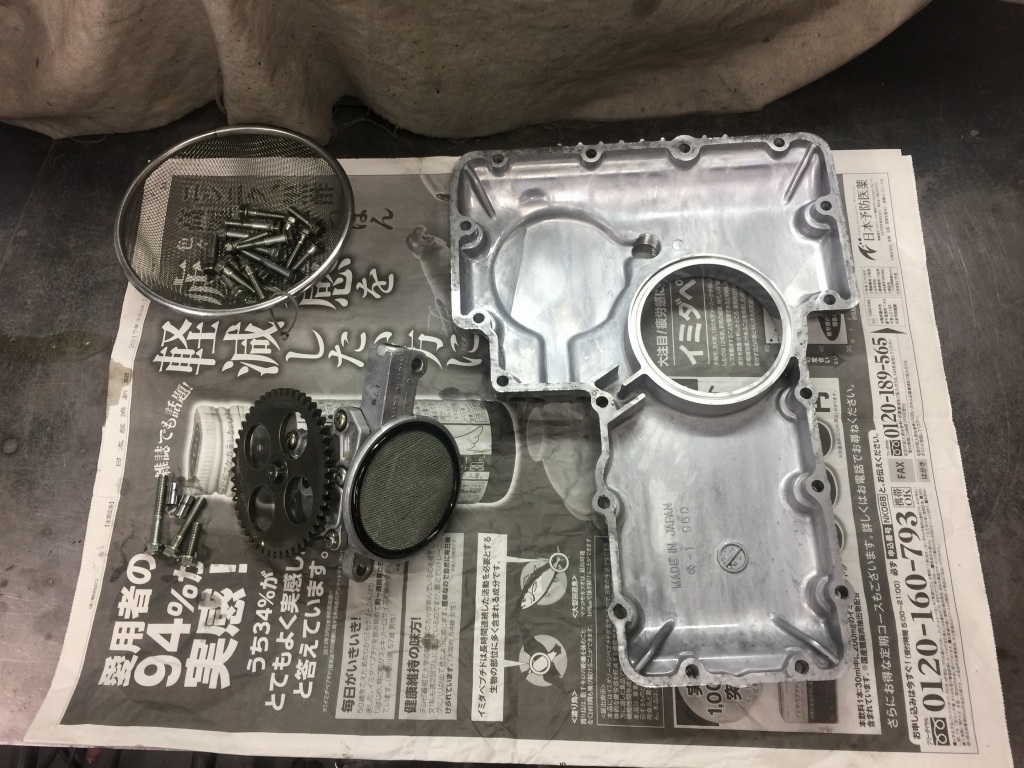 オイルパンとオイルポンプを洗浄して組み付けます。