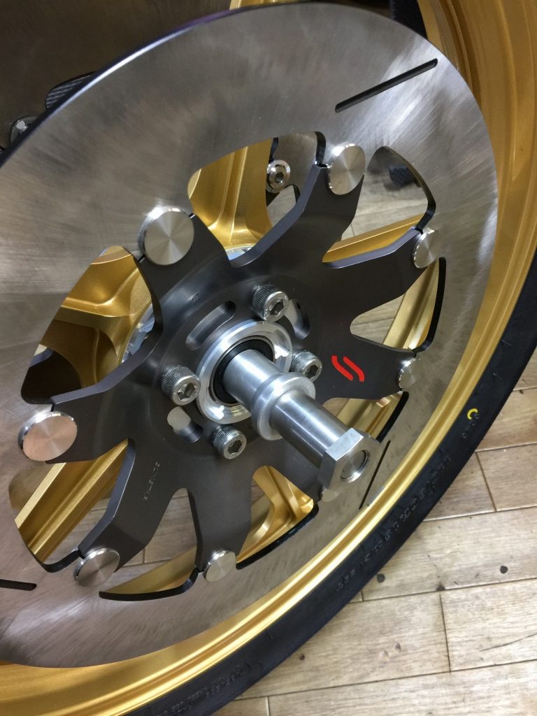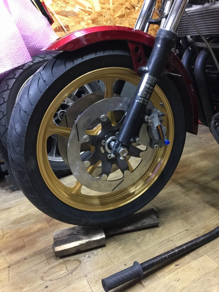 今回装着するのは、ホイールはソードのヘリテイジ。前後ローターはサンスター。外径は、フロントφ320ミリのリヤφ250ミリです。