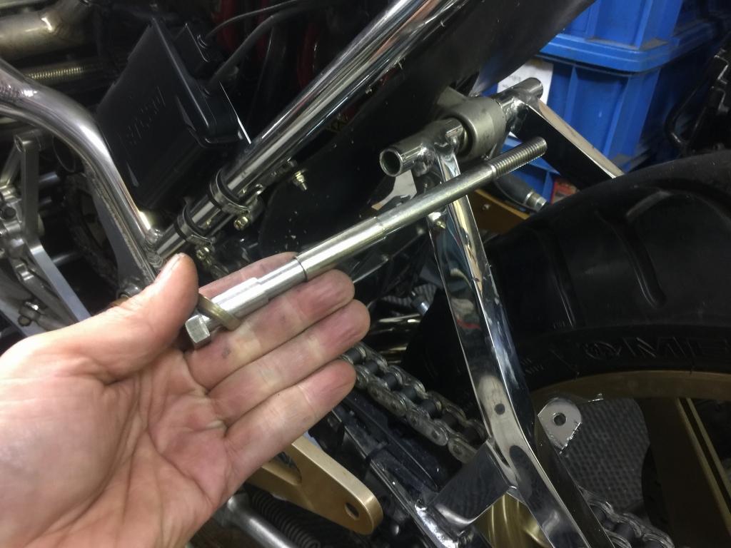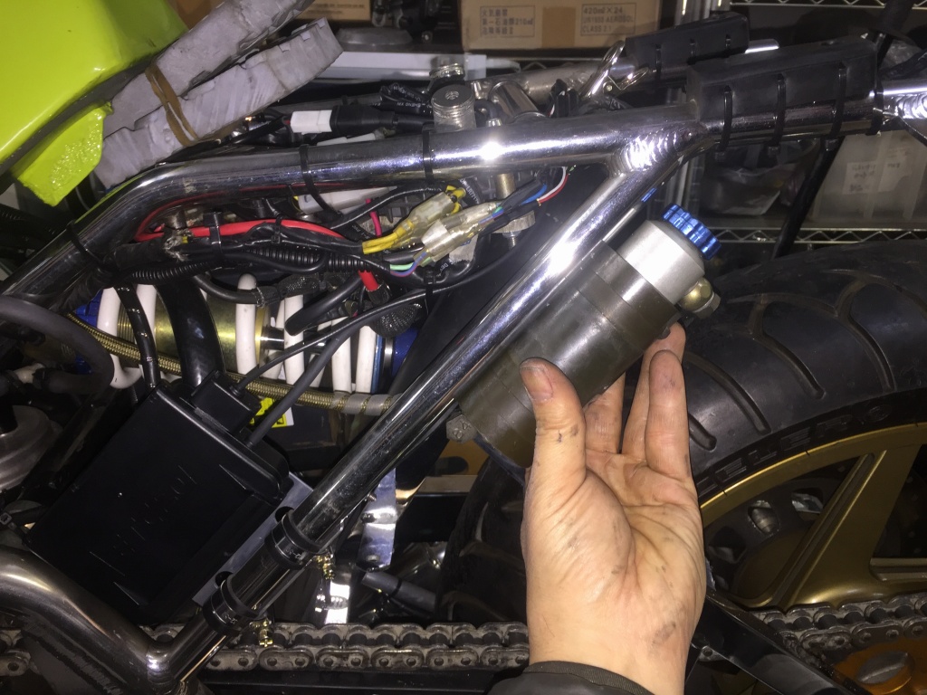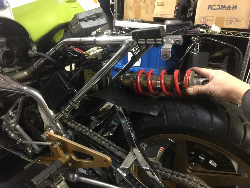 リヤショックを外します。他車流用とのことですが、詳細は不明。