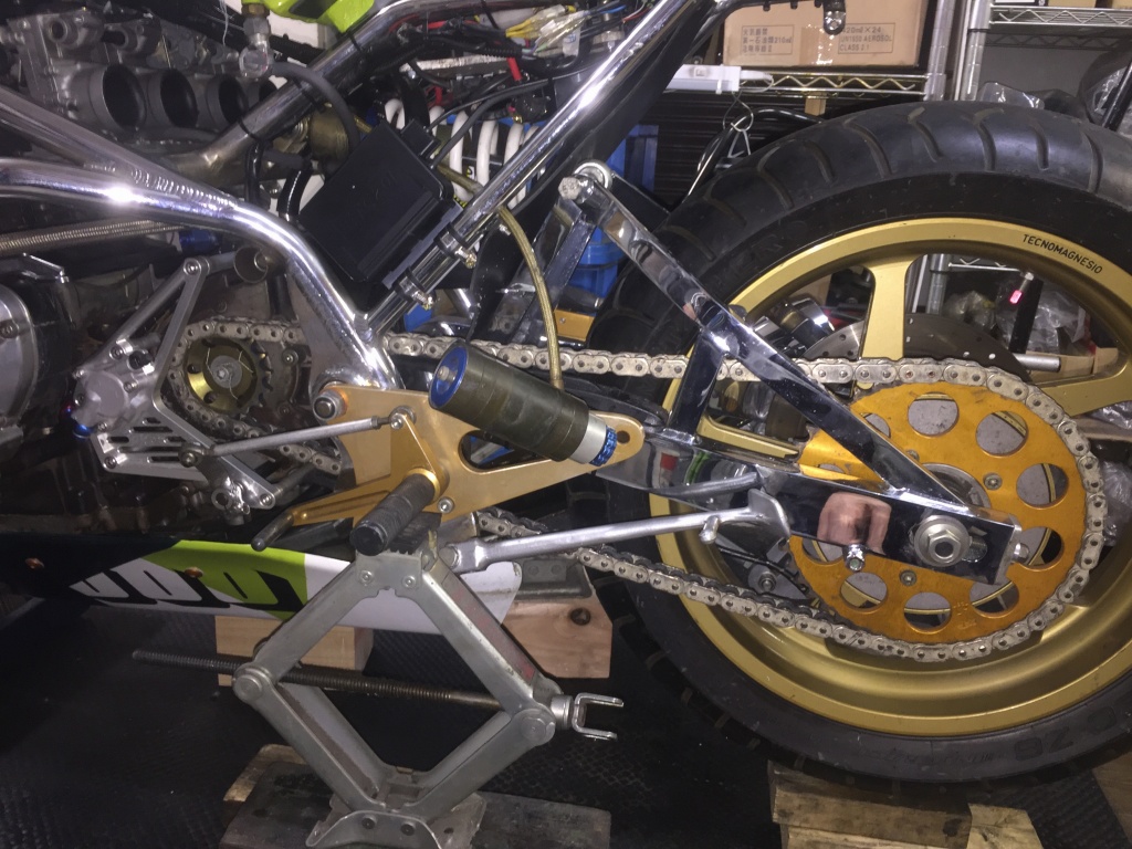 スイングアーム側のマウントボルトはサイズダウンされた1本もの。