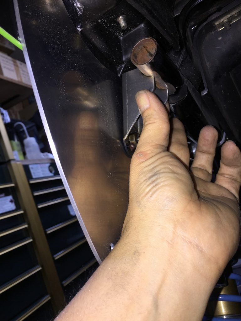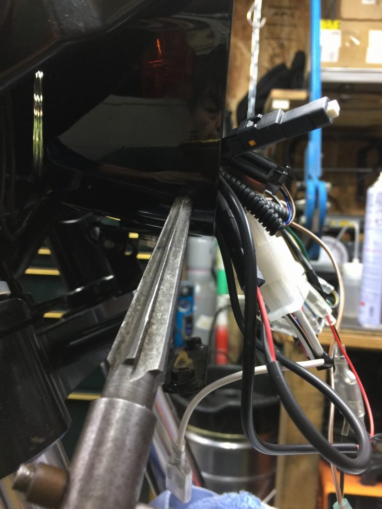 弊社製のFRPヘッドライトケースを装着しますが、ノーマルのツバ付きカラーを装着するには、穴を少し広げます。
