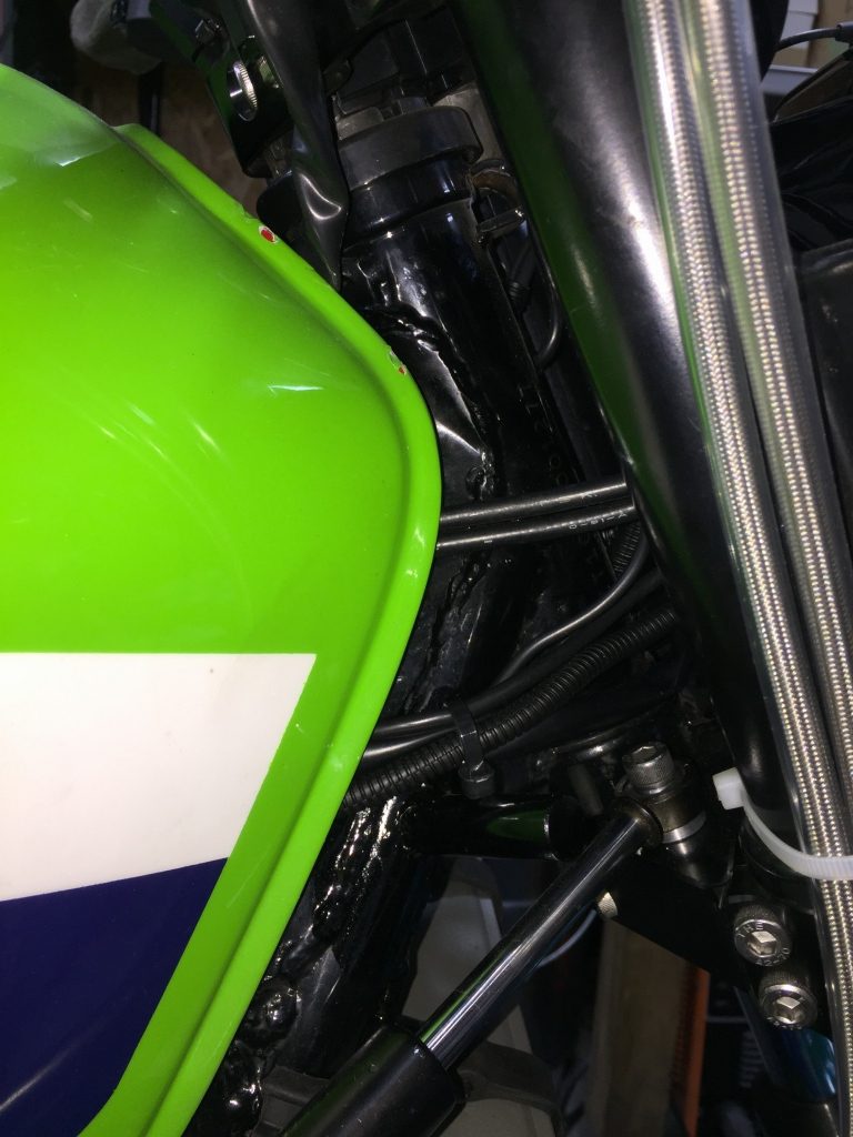 メインハーネスを小分けにした部分は、フレーも左サイドのタンクとの隙間に通します。下側3本のコルゲートチューブがメインハーネスです。