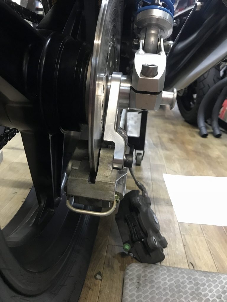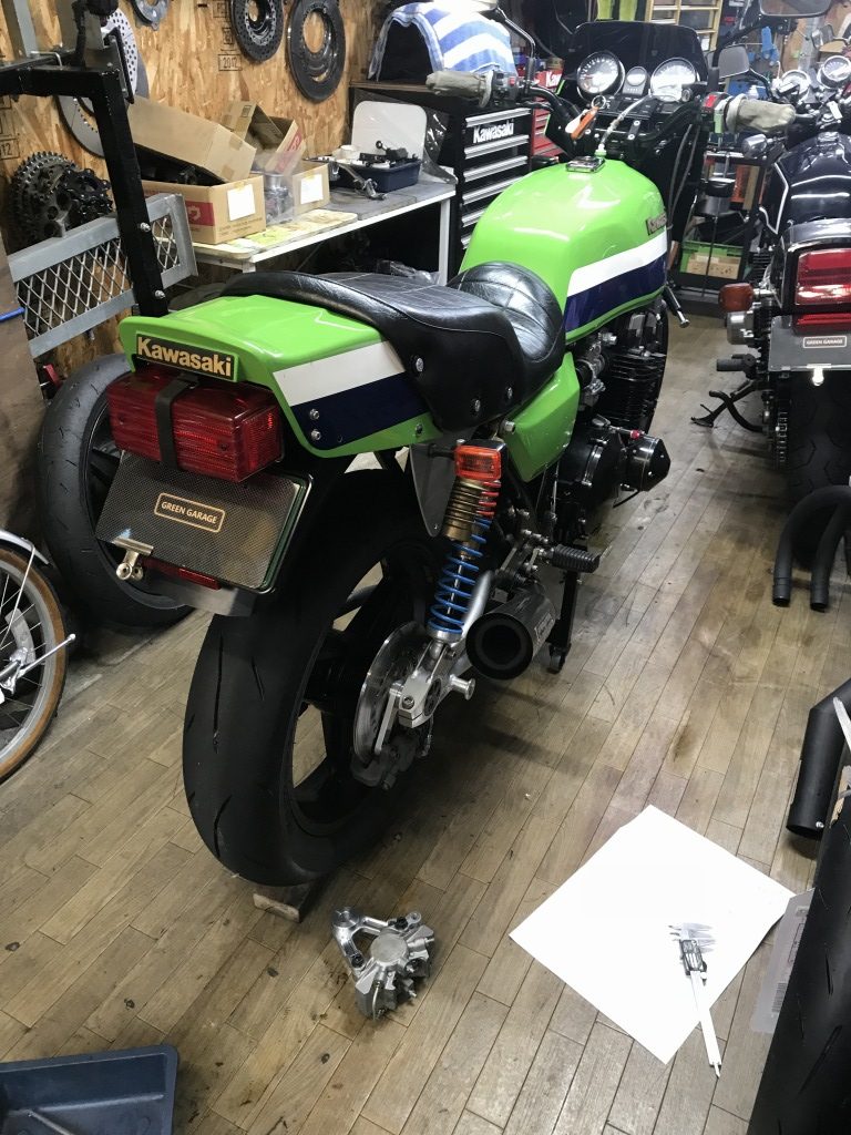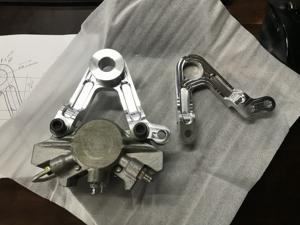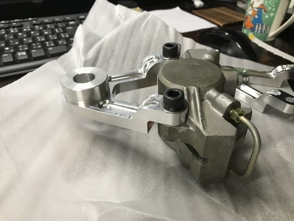 投稿日: 2018年10月1日 投稿者: greengarageZ1100R T.N様 S1リヤキャリパーサポート製作 S1タイプのリヤキャリパーサポートの機械加工が完成しました。 S1の物は鋳物なので、この後角を落とすなどして鋳物風に追加工します。 裏側はこんな感じ。 キャリパーはフロント用のS1キャリパーを使うので、トルクロッド受けもサポートに作り込んであります。 とこから見るとこんな感じ。 角を落として丸みをつけ、鋳物風に仕上げてみました。 この後、サンドブラストしてからアルマイトします。 現車で取り付け確認します。 ローターはφ234ミリです。 取り付けるとこんな感じ。