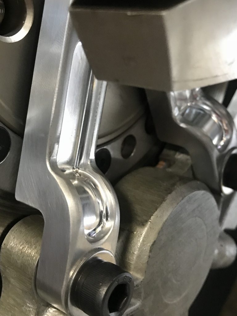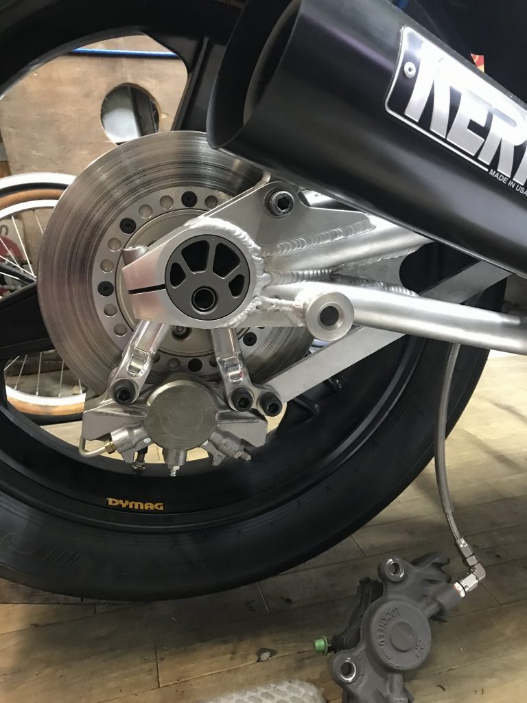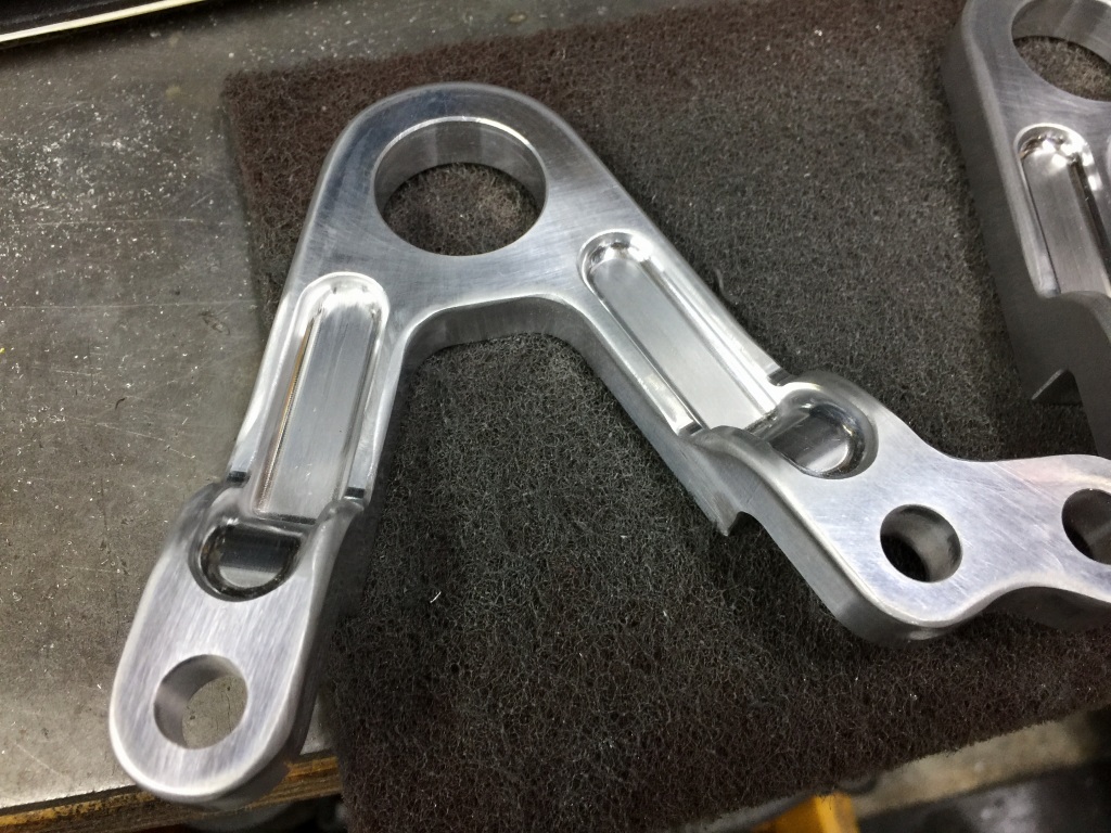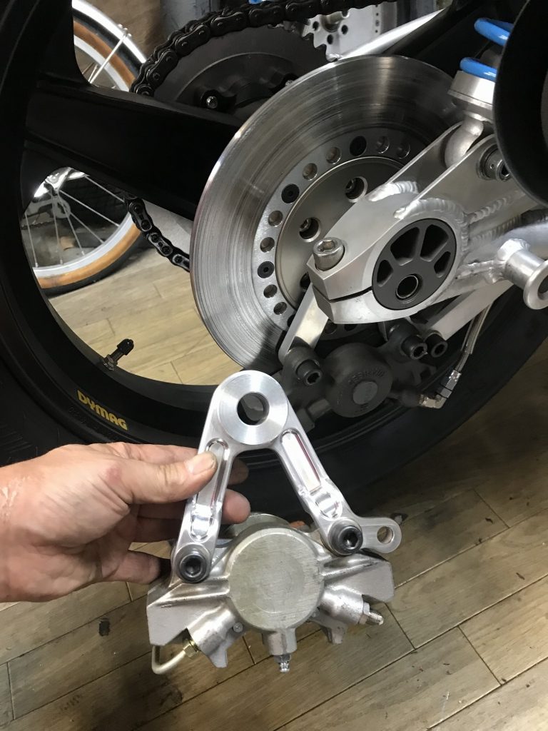 投稿日: 2018年10月1日 投稿者: greengarageZ1100R T.N様 S1リヤキャリパーサポート製作 S1タイプのリヤキャリパーサポートの機械加工が完成しました。 S1の物は鋳物なので、この後角を落とすなどして鋳物風に追加工します。 裏側はこんな感じ。 キャリパーはフロント用のS1キャリパーを使うので、トルクロッド受けもサポートに作り込んであります。 とこから見るとこんな感じ。 角を落として丸みをつけ、鋳物風に仕上げてみました。 この後、サンドブラストしてからアルマイトします。 現車で取り付け確認します。 ローターはφ234ミリです。 取り付けるとこんな感じ。