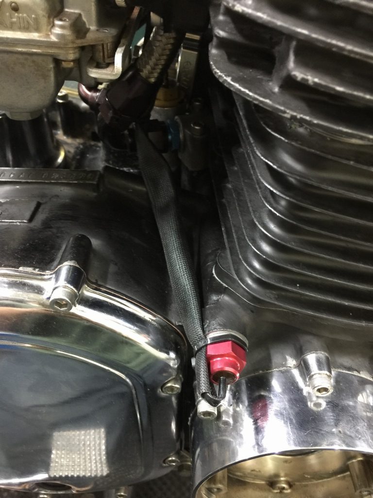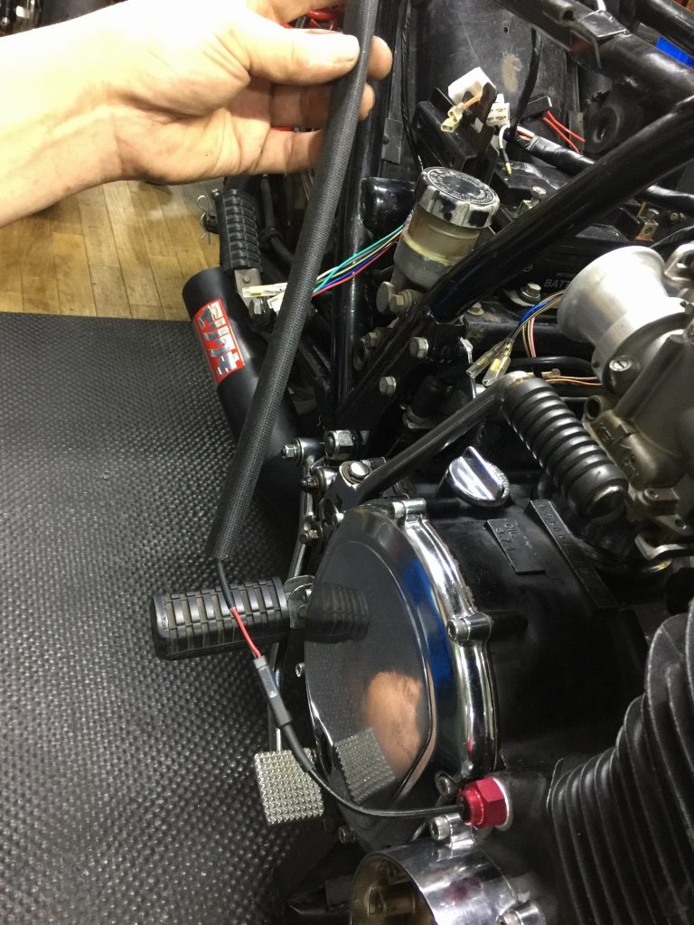 ヨシムラテンプセンサーのハーネスは、耐熱性のガラス編組チューブに通します。