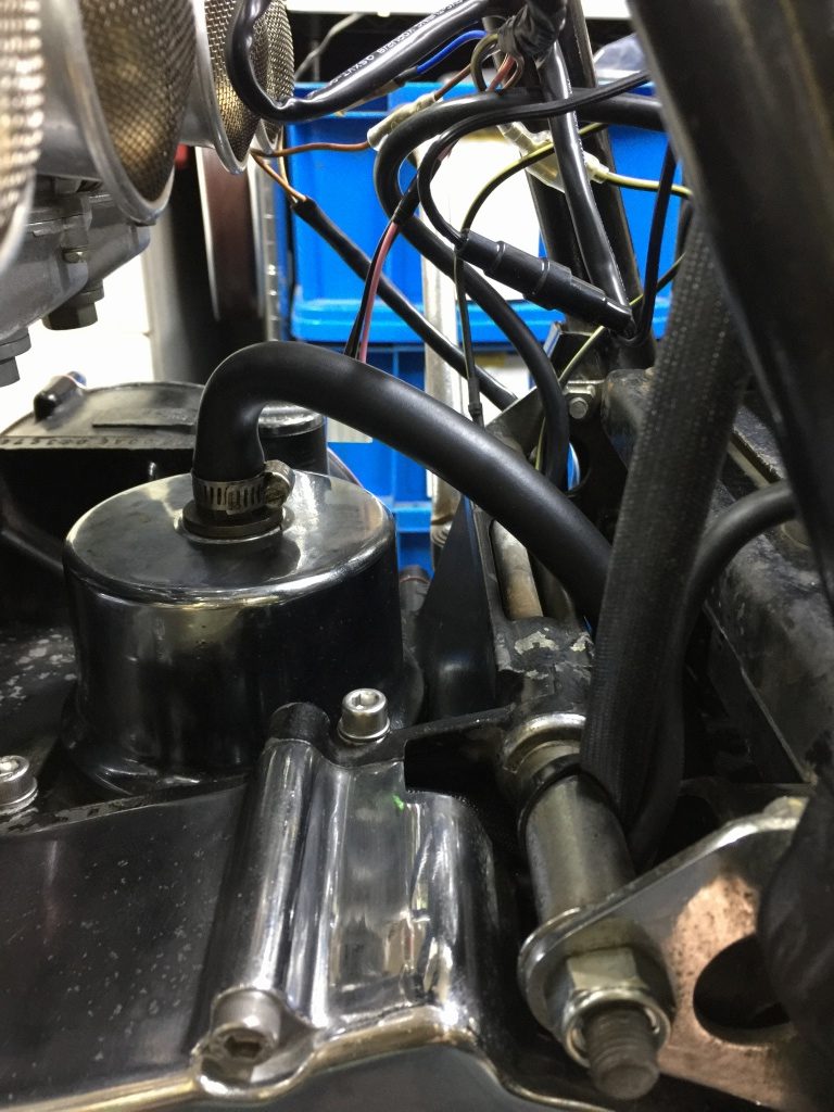 ブリーザーホースは、収まりのいい90°ホースを使用。