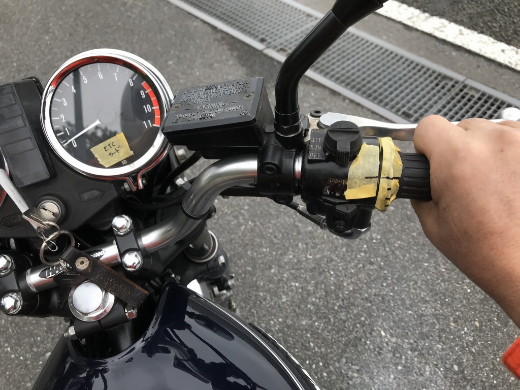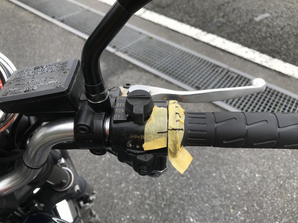 スロットル開度を正確に把握するため、グリップのところに目盛りを付けて走ります。これが全閉時。目盛りは4等分してあるのでそれぞれ 1/4 1/2 3/4 全開 などを一定時間維持して確認します。