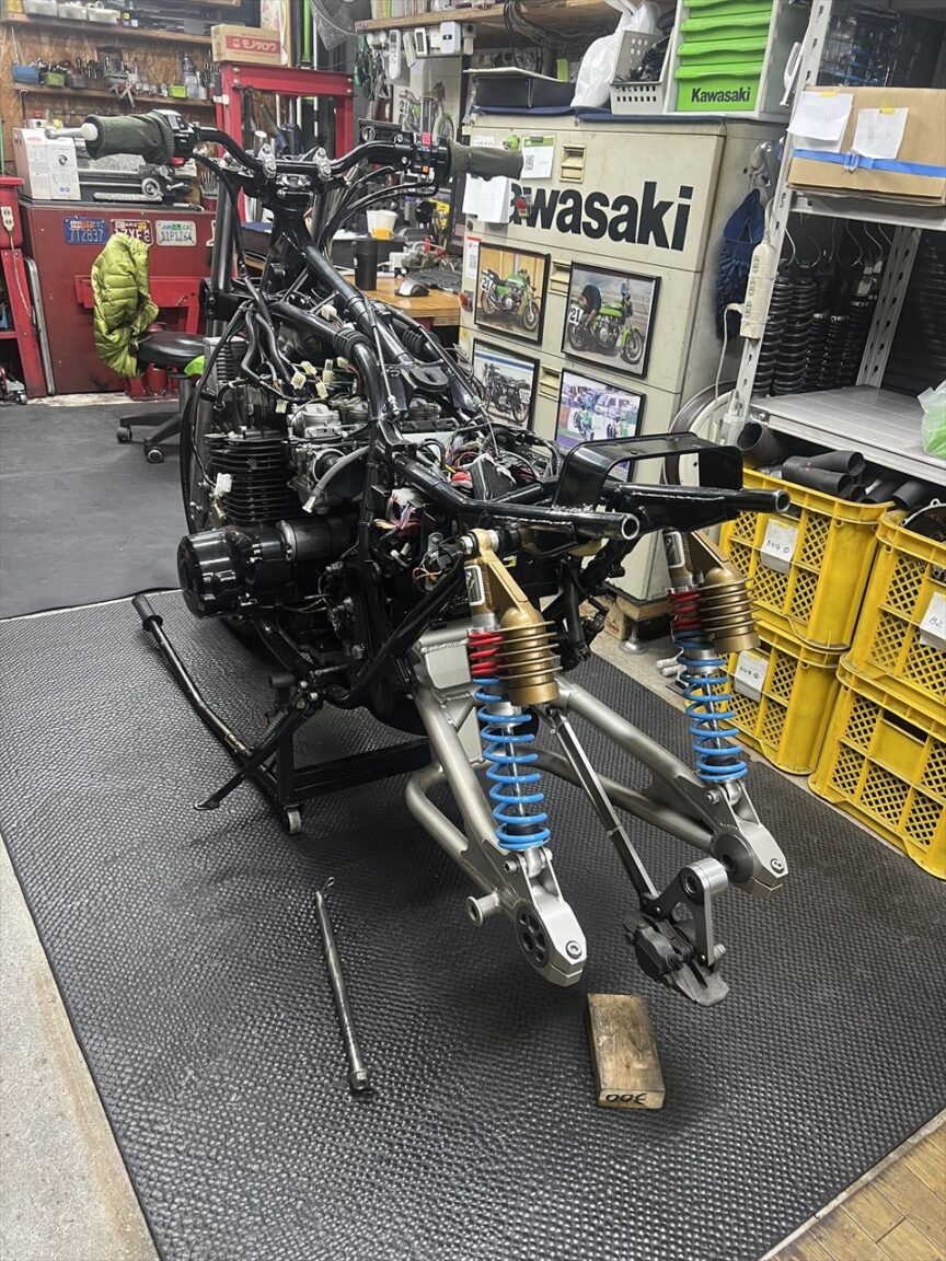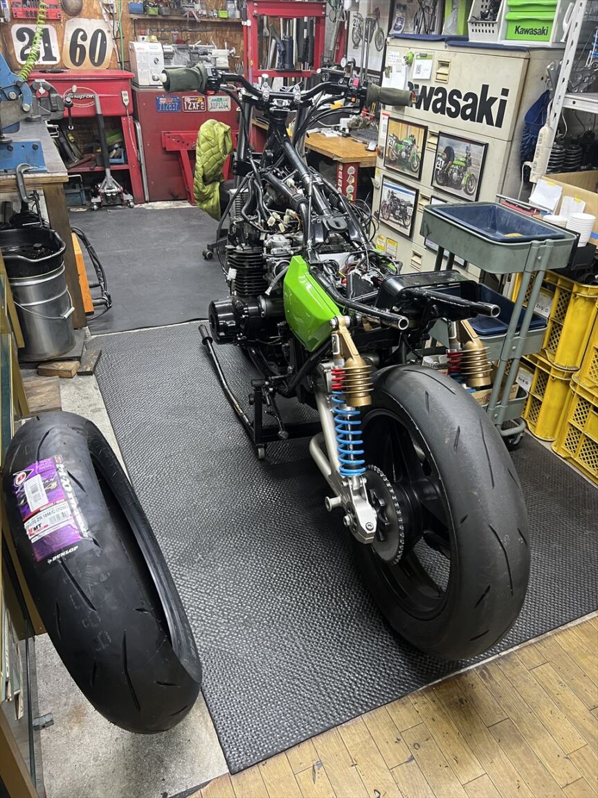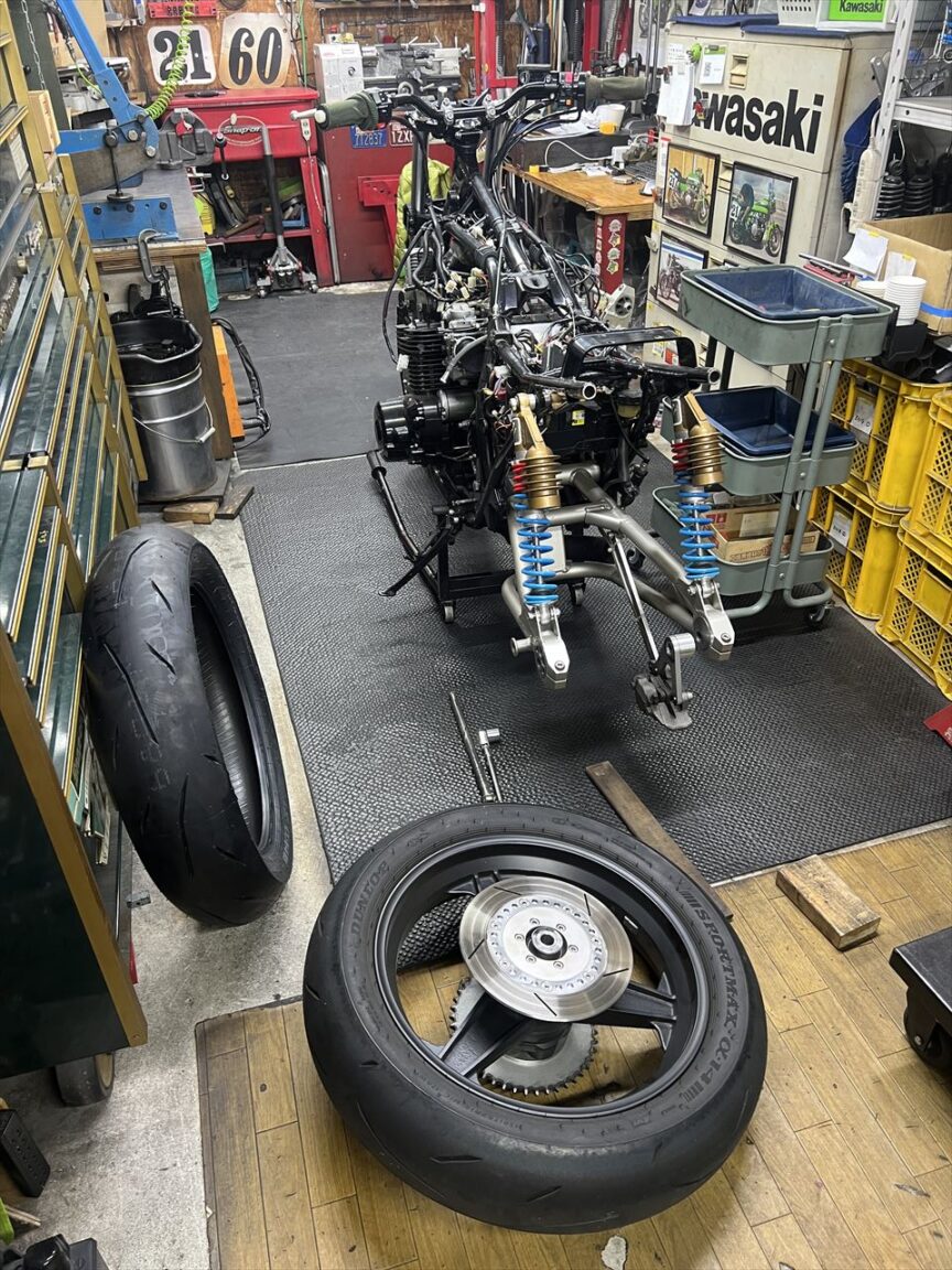 リヤ周りはスイングアーム交換からワークスステップ取り付けのフレーム加工など盛りだくさんです。先ずはリヤホイールを外します。