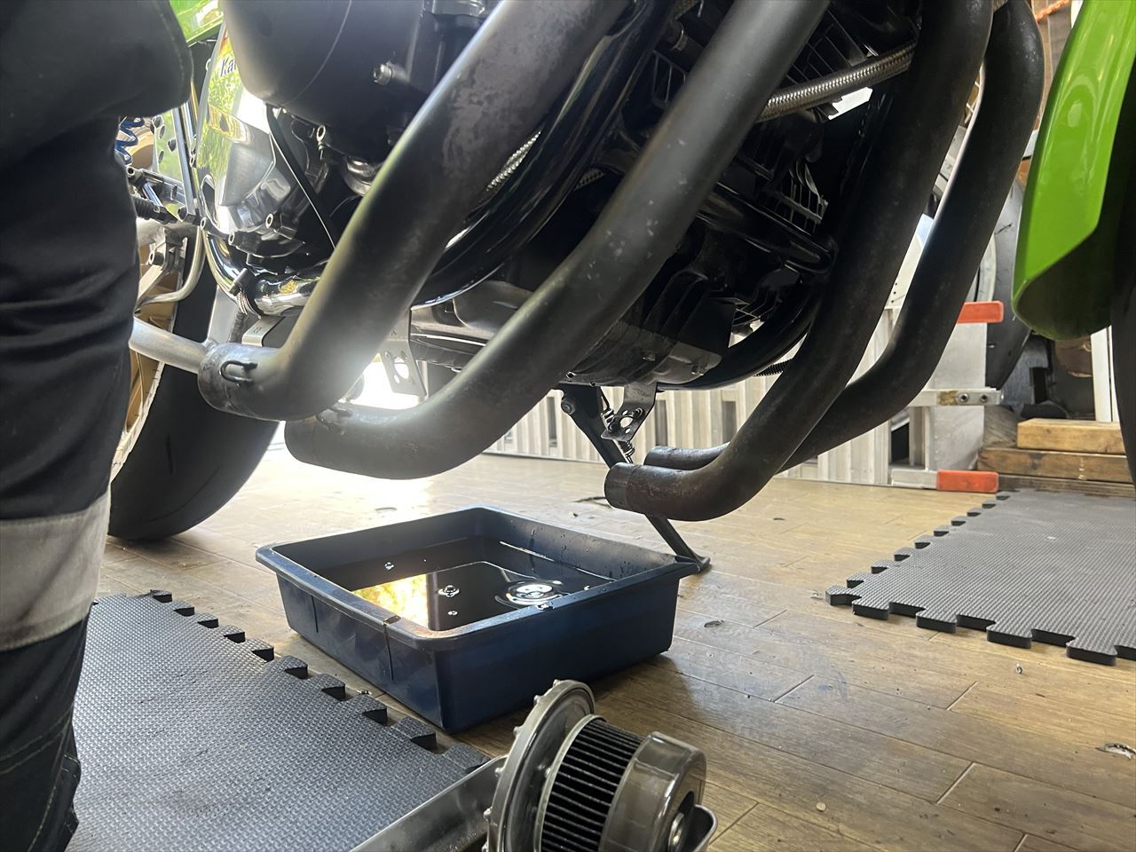 マフラーの集合部以降を外してエキパイを外側に避け、エンジンオイルとフィルターを交換します。