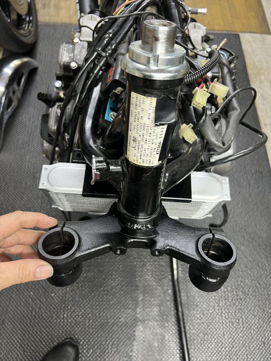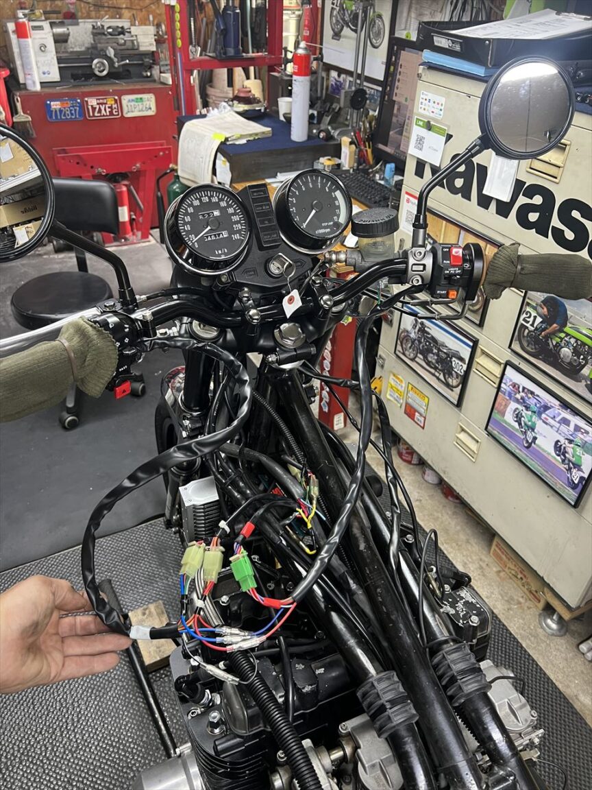 もともとヘッドライトスイッチが左にあったため、今回はOWタイプのハンドルスイッチに変更した右側にヘッドライトスイッチが移動しました。その関係で右から左に電源線が繋がります。