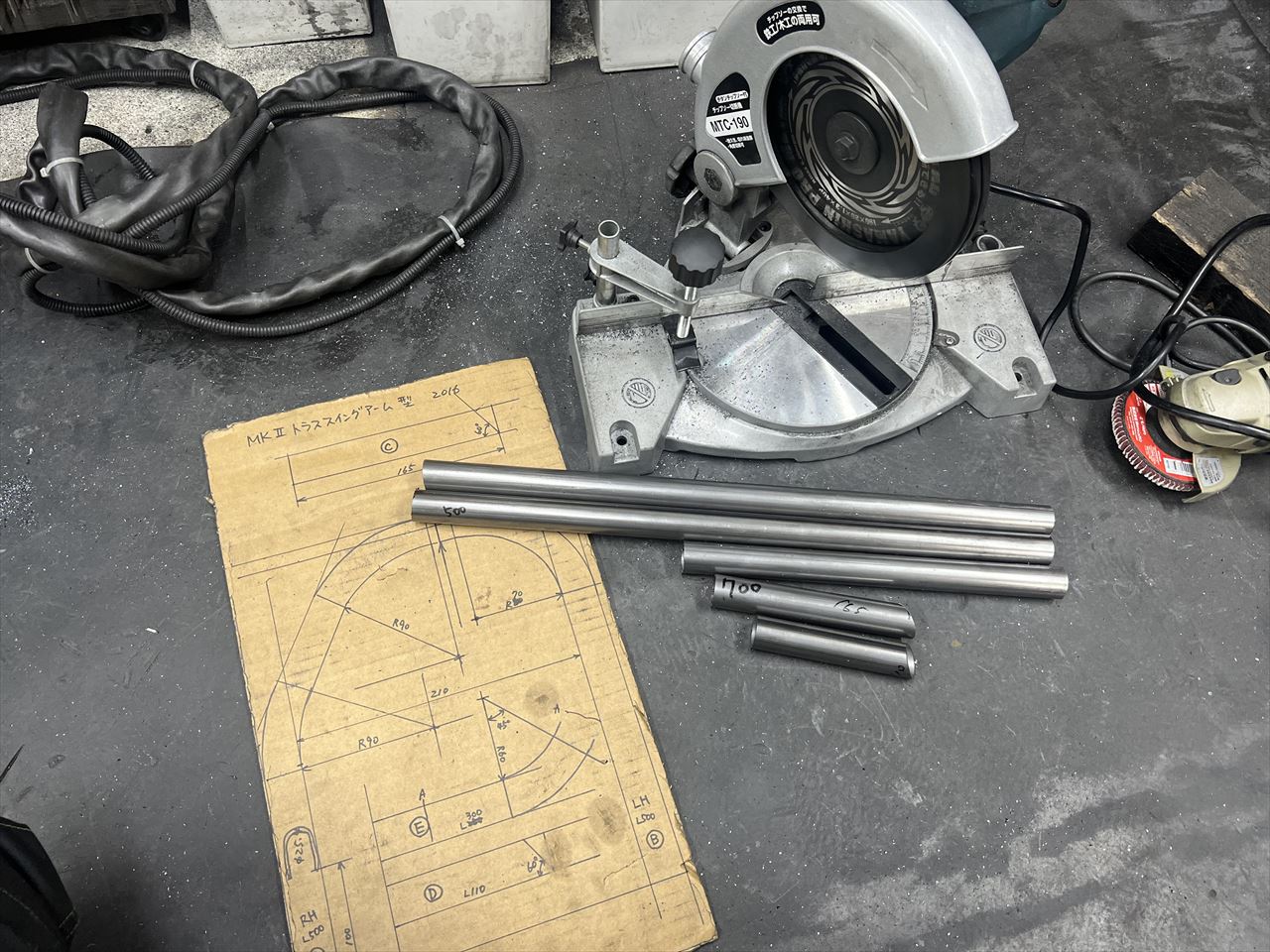 ワークススイングアームの方は、トラス補強パイプの製作から。先ずは長尺材から切り出します。