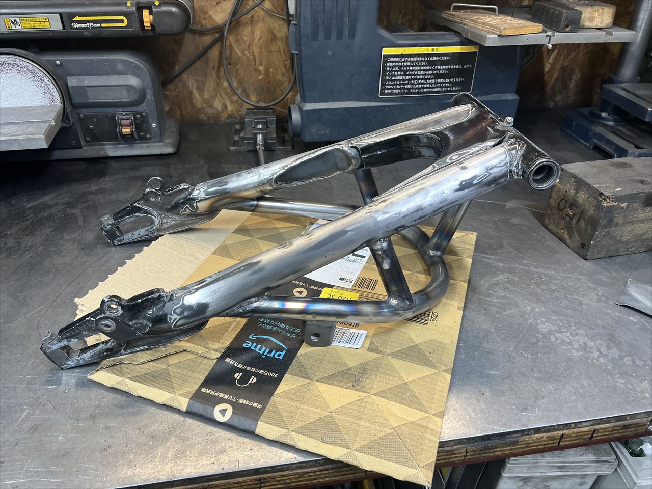 ワークススイングアームの溶接が終わりました。ペーパーで表面を軽くサンディングします。