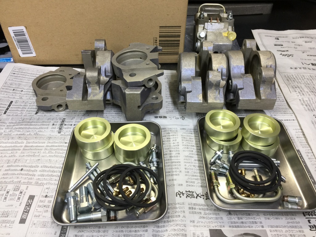 スイングアームの修理と合わせて、足回り全般の点検とカスタムを行うことになりましたので、必要な部品を送っていただきました。