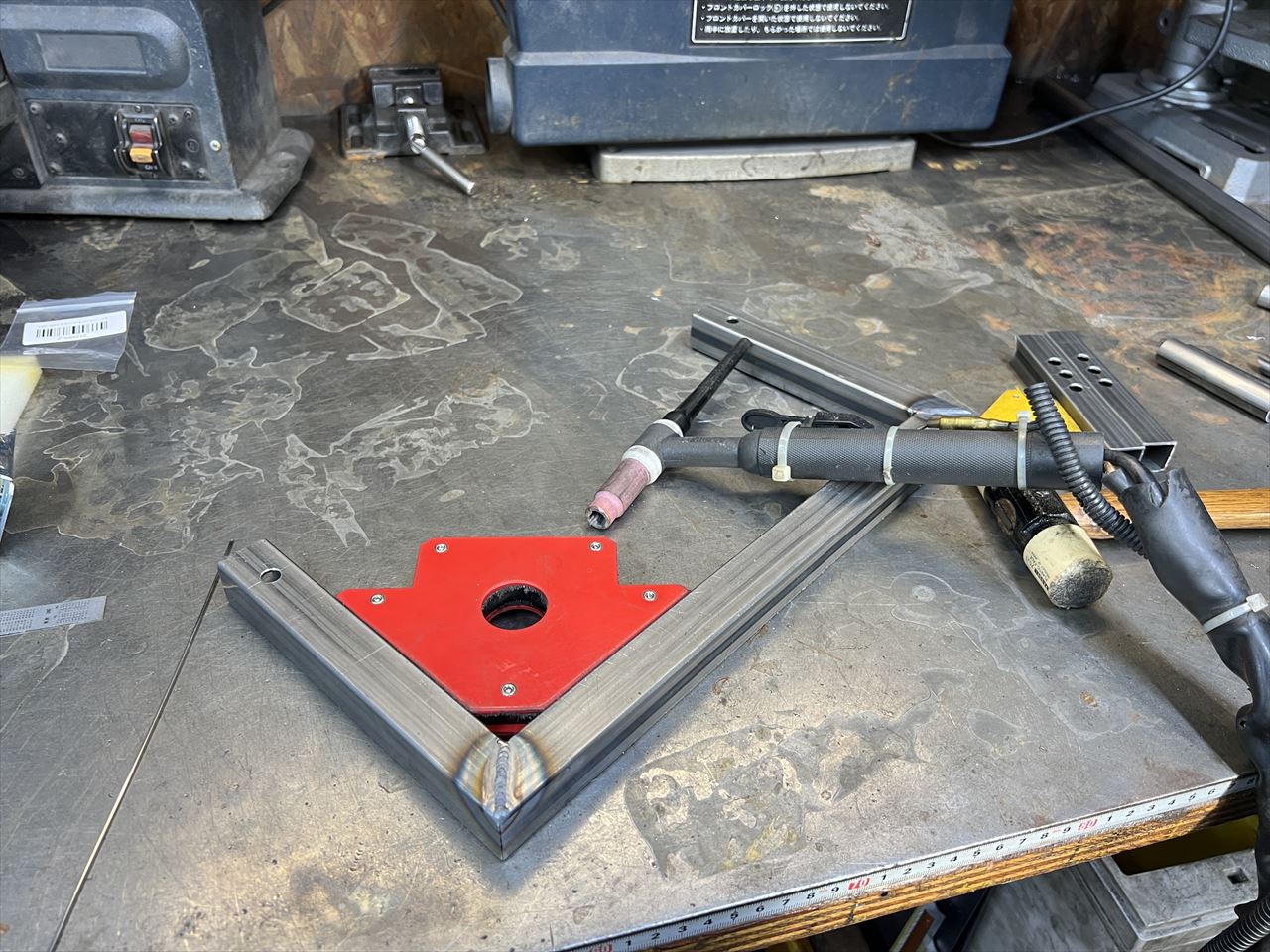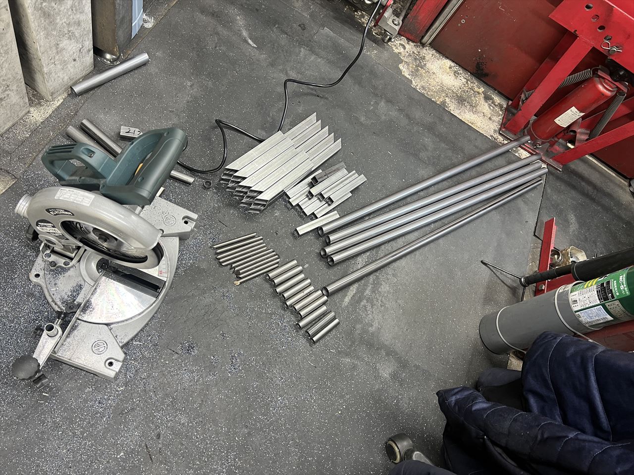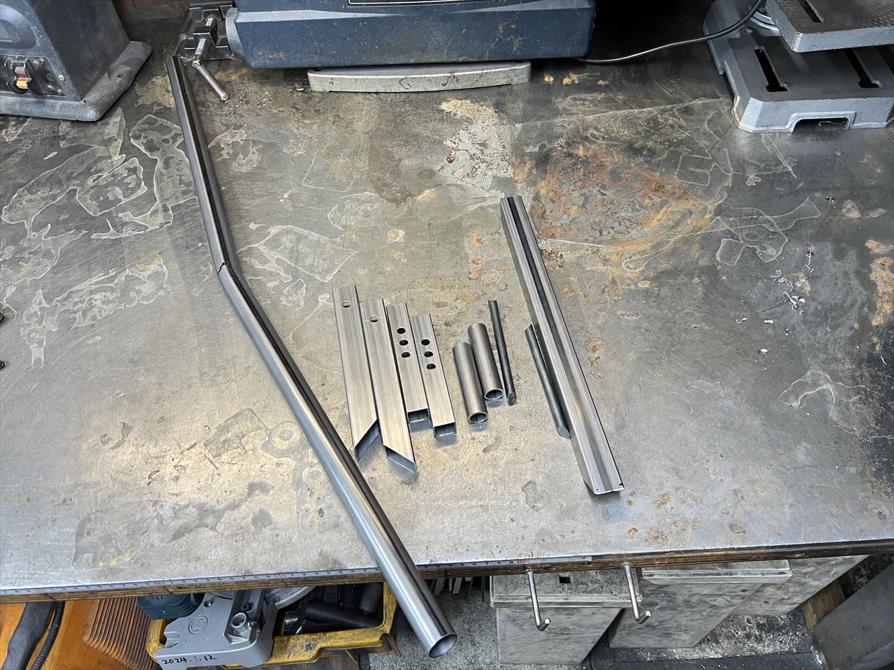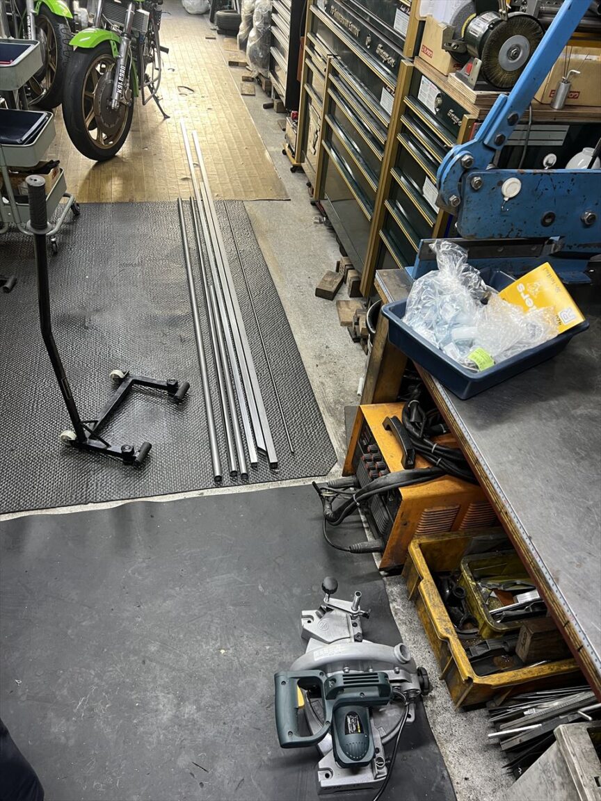 2025年最初のフレームスタンド製作です。今回はバックオーダー分4本と在庫用1本の計5本製作します。先ずは長いスチールパイプなどから所定の長さに切り出します。